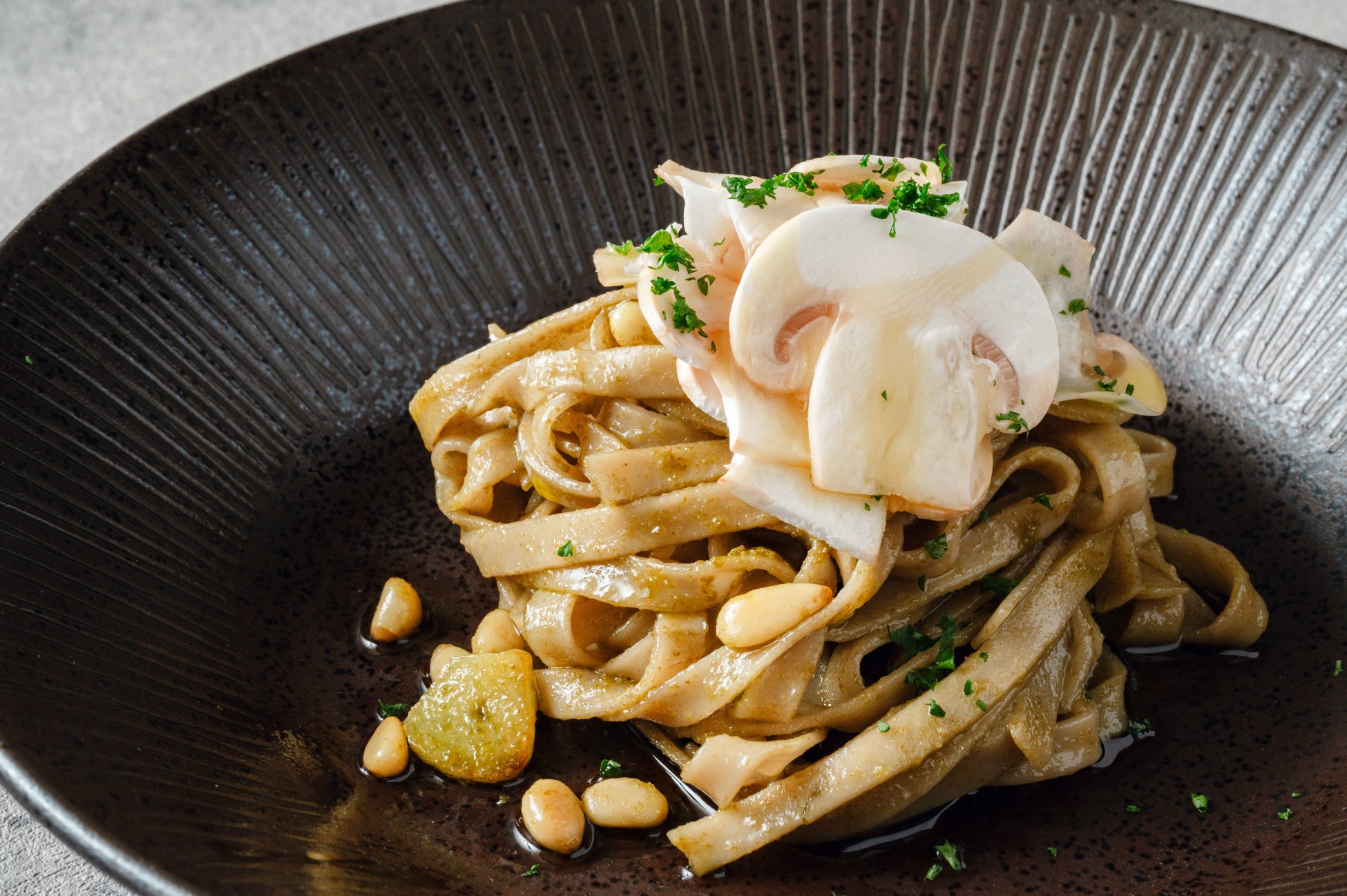 ゴロゴロっと添えられた松の実の香ばしさとコクが、チーズ不使用とは思えない食べ応えを実現。上に散らした生のスライスマッシュルームの瑞々しさとともにどうぞ。