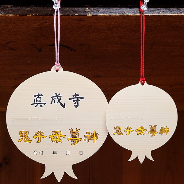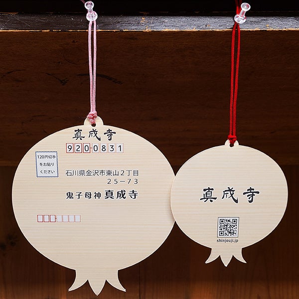 また、真成寺は鬼子母神を祀るお寺であることから、境内にもたくさんのザクロの樹があり、「ざくろ寺」という別称もあります。鬼子母神のザクロ伝説もよく知られているため、絵馬の形にザクロを採用いたしました。