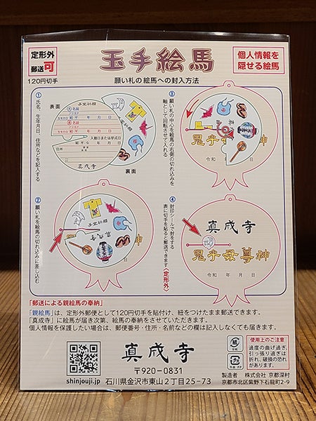 丸い御札を回転させながら、丸い絵馬に挿入させる方法で、御札に記入した個人情報を隠しながら、封書のように定形外郵便として120円切手を貼り付けて、真成寺へ郵送することができる絵馬なのです。