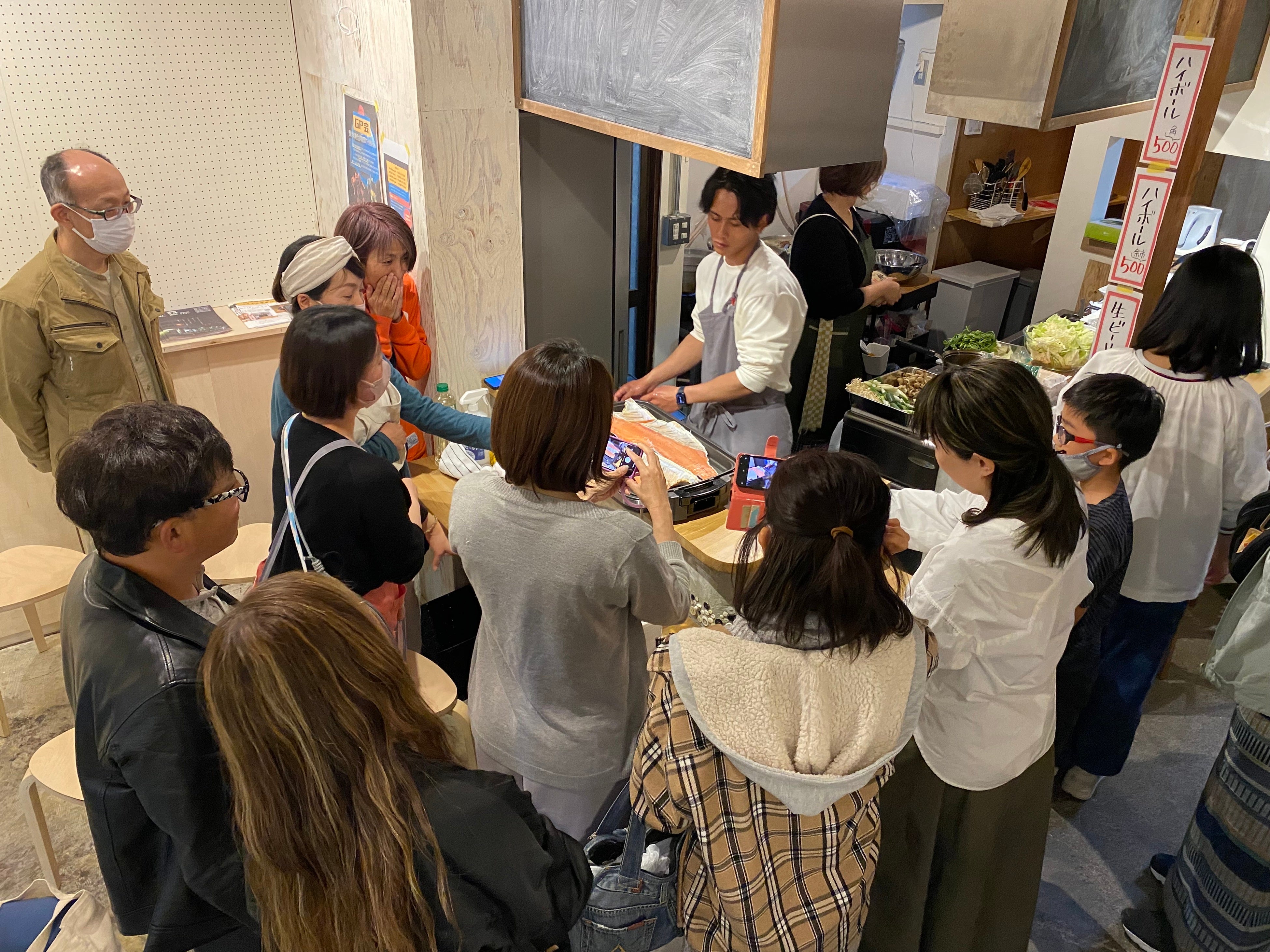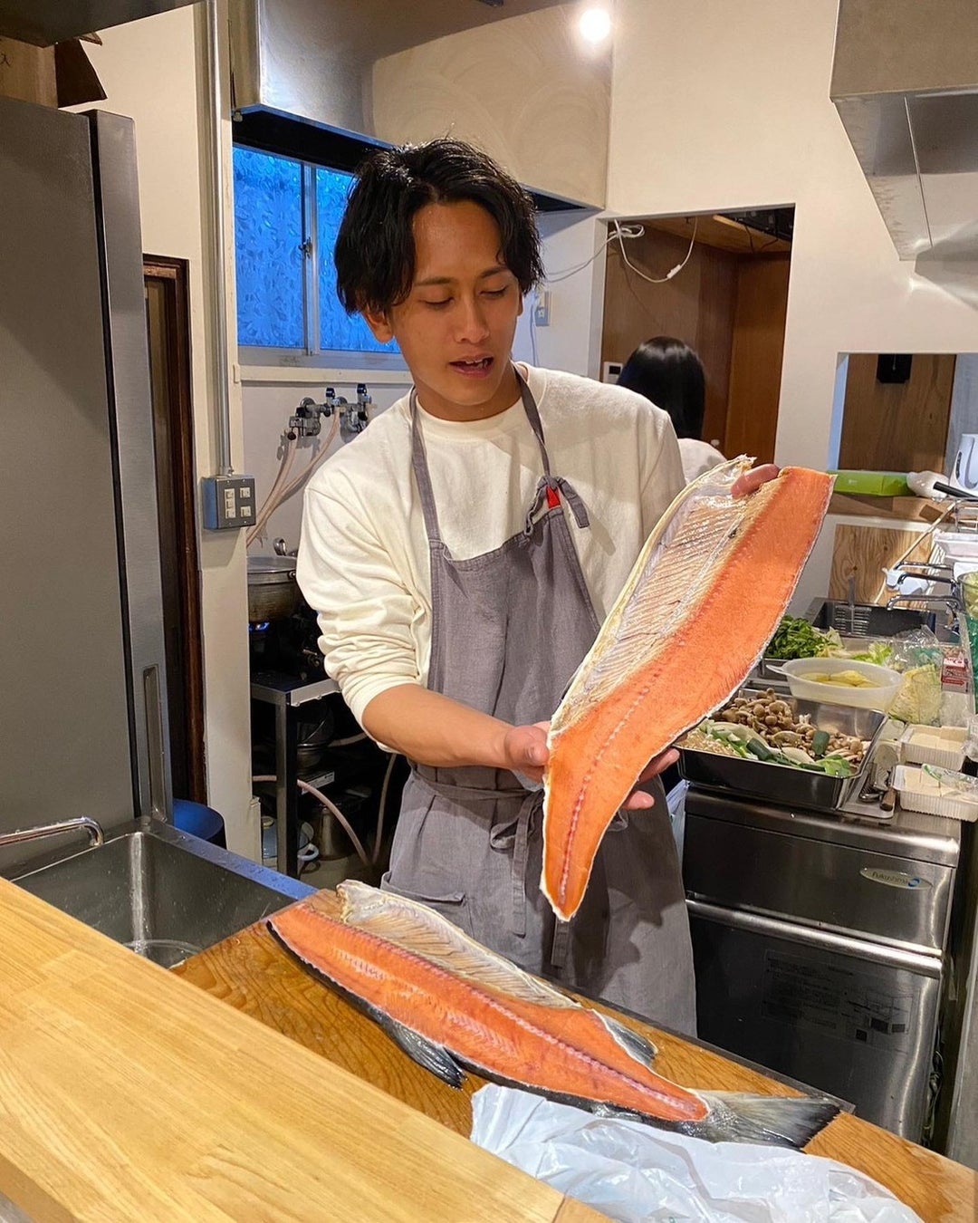 「ふるシェア」連携予定地域の北海道斜里町から、tiktokで人気のイケメン漁師が登場。知床のことや鮭漁のこと、流氷のことなど、斜里町の魅力を語っていただきました。その後は鮭まるまる1匹の解体ショーを行い、20名以上の参加者と鮭を中心に知床の食材を食べながら交流を行いました。