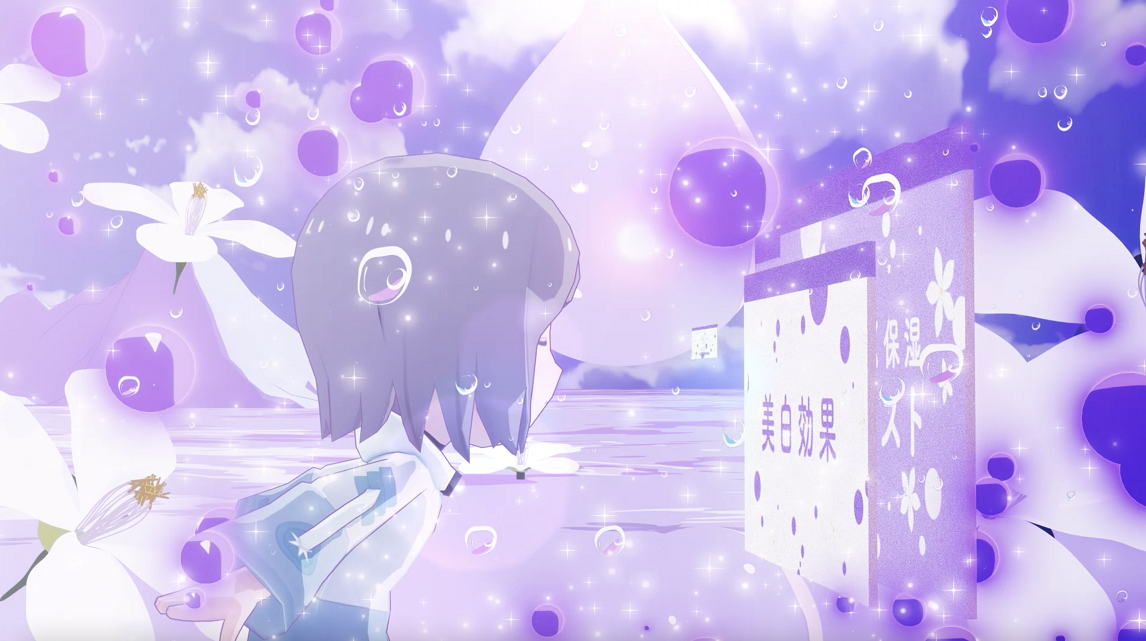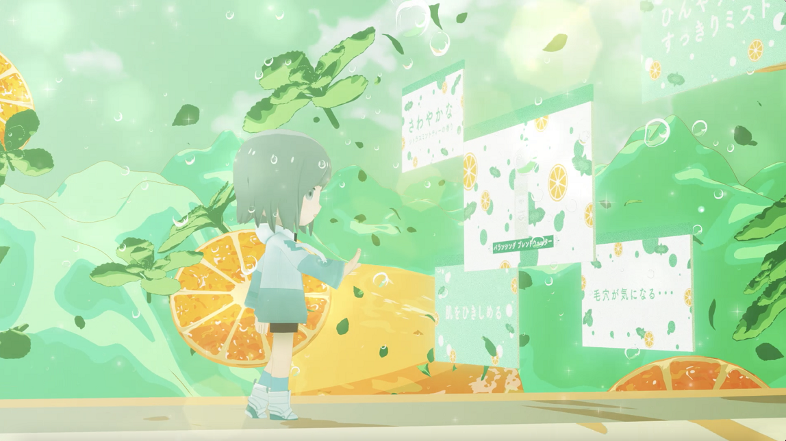 VR空間に入って体験しないと解りにくいのですが、VRの世界って、デジタル空間なのに本当に空間があるように感じるんです。この商品は化粧水なのにそれぞれ不思議と世界感を持ってる所が面白く、広がりがあるのがVRの世界を体験するのに似てるなと思い、こういう設定にしました。ぜひ映像をみて、この化粧水、独特の世界観を堪能してみてください。