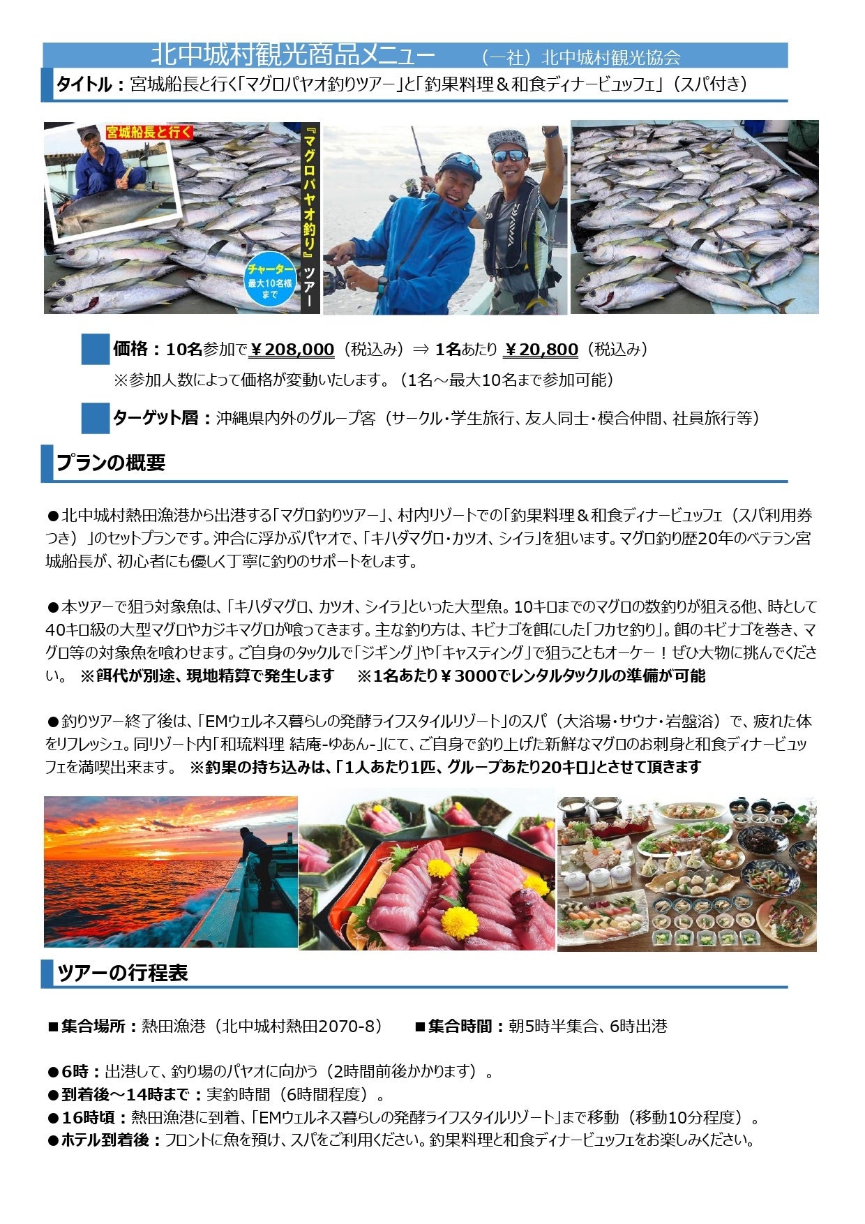 〇北中城村ふるさと納税御礼品『マグロ釣りパヤオツアーと釣果料理&和食ディナービュッフェ(スパ利用券付)』※参加人数1名~6名ごとに、必要寄付金額が異なります