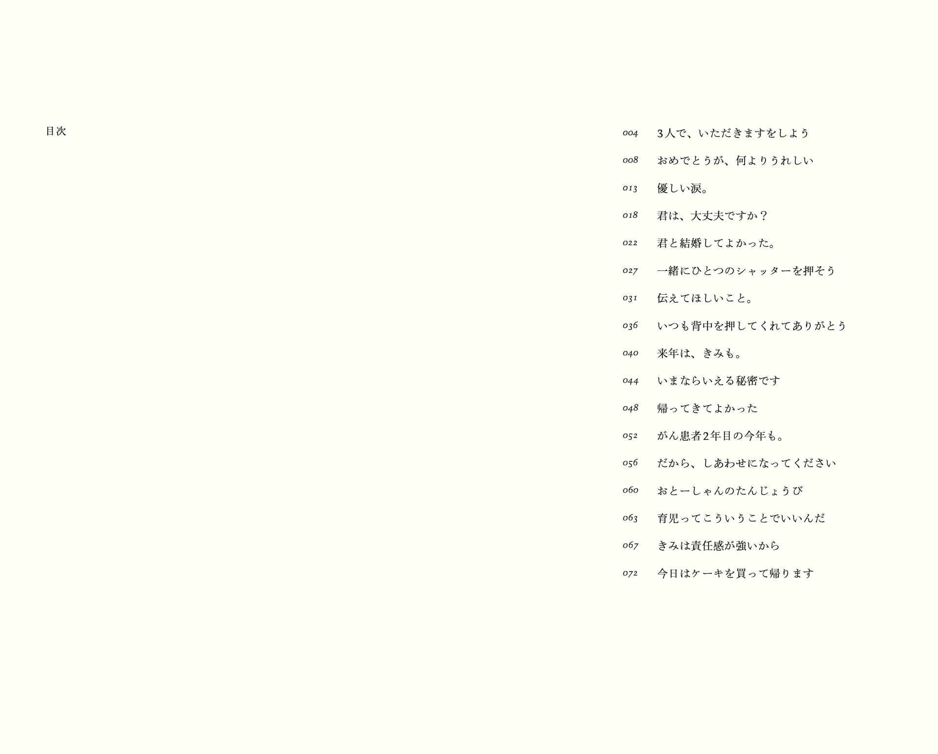 治らないがんを宣告された写真家が、日々の暮らしの中で思い、考え、伝えるのは「家族のありかたは自分たちで決めよう」ということ。 育児、仕事、お金、遊び、友人、病気、旅行、家族、食事。私たちの毎日は様々な選択の連続です。その選択一つ一つを、自分できちんと考え、自分で決めよう。限られた時間、残された時間の使い方を、習慣や世間体などに惑わされず、自分の意志で選び取ろう。それが自由で豊かな人生につながるのだ。著者はそう繰り返します。
