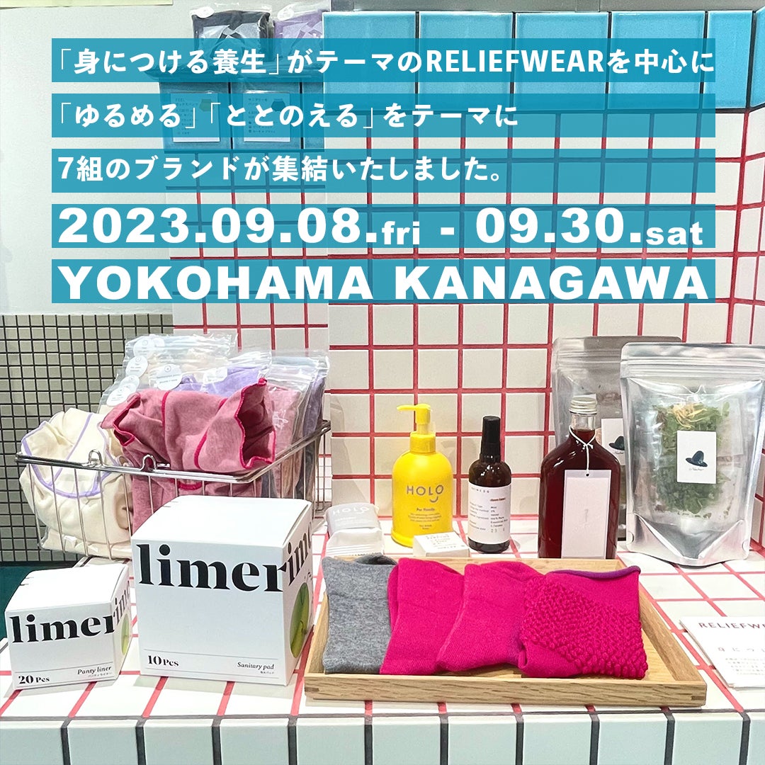 「身につける養生」がテーマのRELIEFWEARを中心に「ゆるめる」「ととのえる」をテーマに7組のブランドが集い、展示販売しております。入場無料となっておりますので、ぜひお気軽にお立ち寄りください。