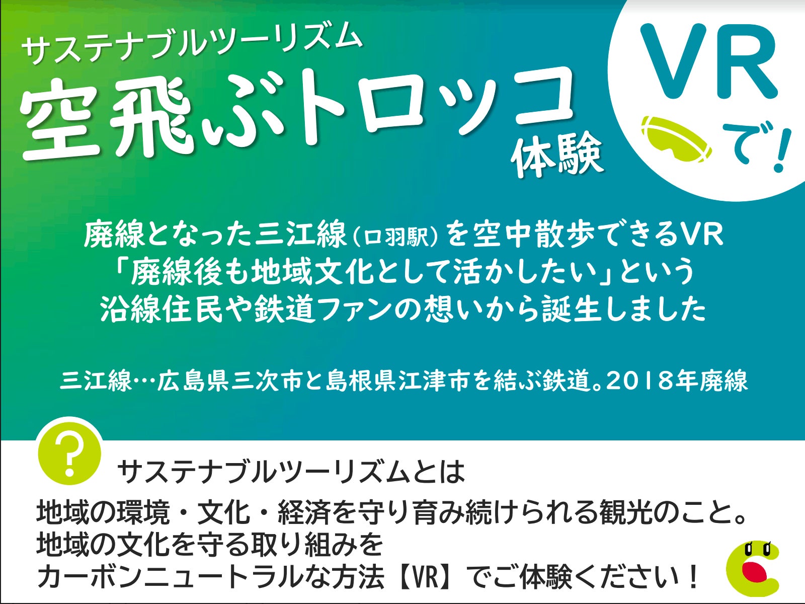 環境に配慮した取り組みを応援するカボニューコミュニティ。ブースでは、環境に配慮した取り組みを行う団体・個人の活動を体験できるワークショップやお話会に参加することができます。また、最先端の技術を活用したVRコンテンツを体験できるVRゴーグルブースを用意しています。当日は、広島県三次市と島根県江津市を結んでいた三江線(現在廃線)の駅を空中散歩できるサスティナブルツーリズム「空飛ぶトロッコ」を体験できます。