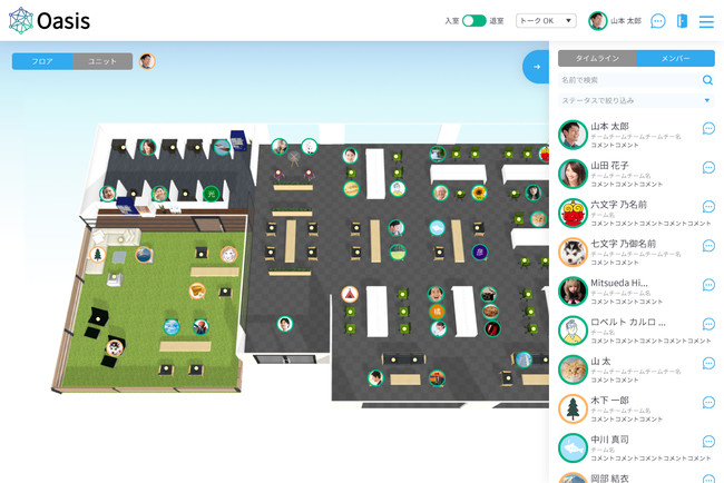 Oasis(オアシス)は、自宅でもオフィスでも、バーチャルスペース上で“みんなと一緒に仕事ができる”リモートワーク・プラットフォームです。