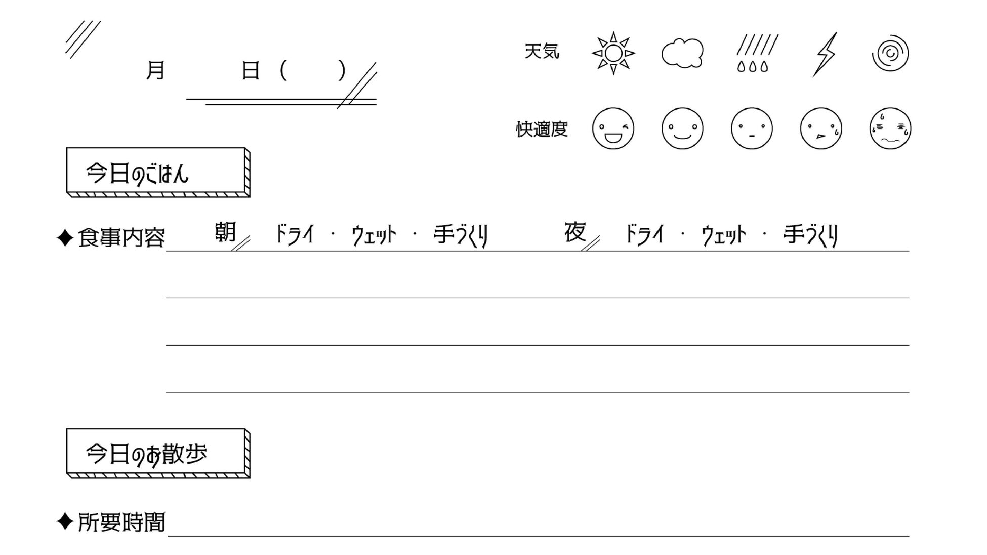 日記ページのレイアウトは、犬との日常に欠かせない項目だけで構成しているから、体調が悪くなったときいつから変化があったのか容易に振り返ることが可能。その日に起きた些細な出来事もメモしておくだけで、いざ振り返ったときに思い出が鮮明に蘇って二度楽しいを味わえます。