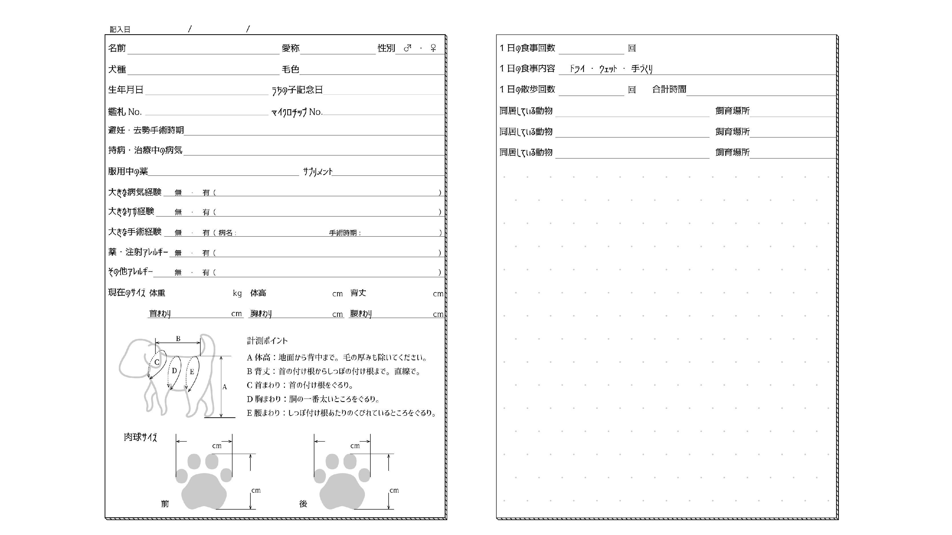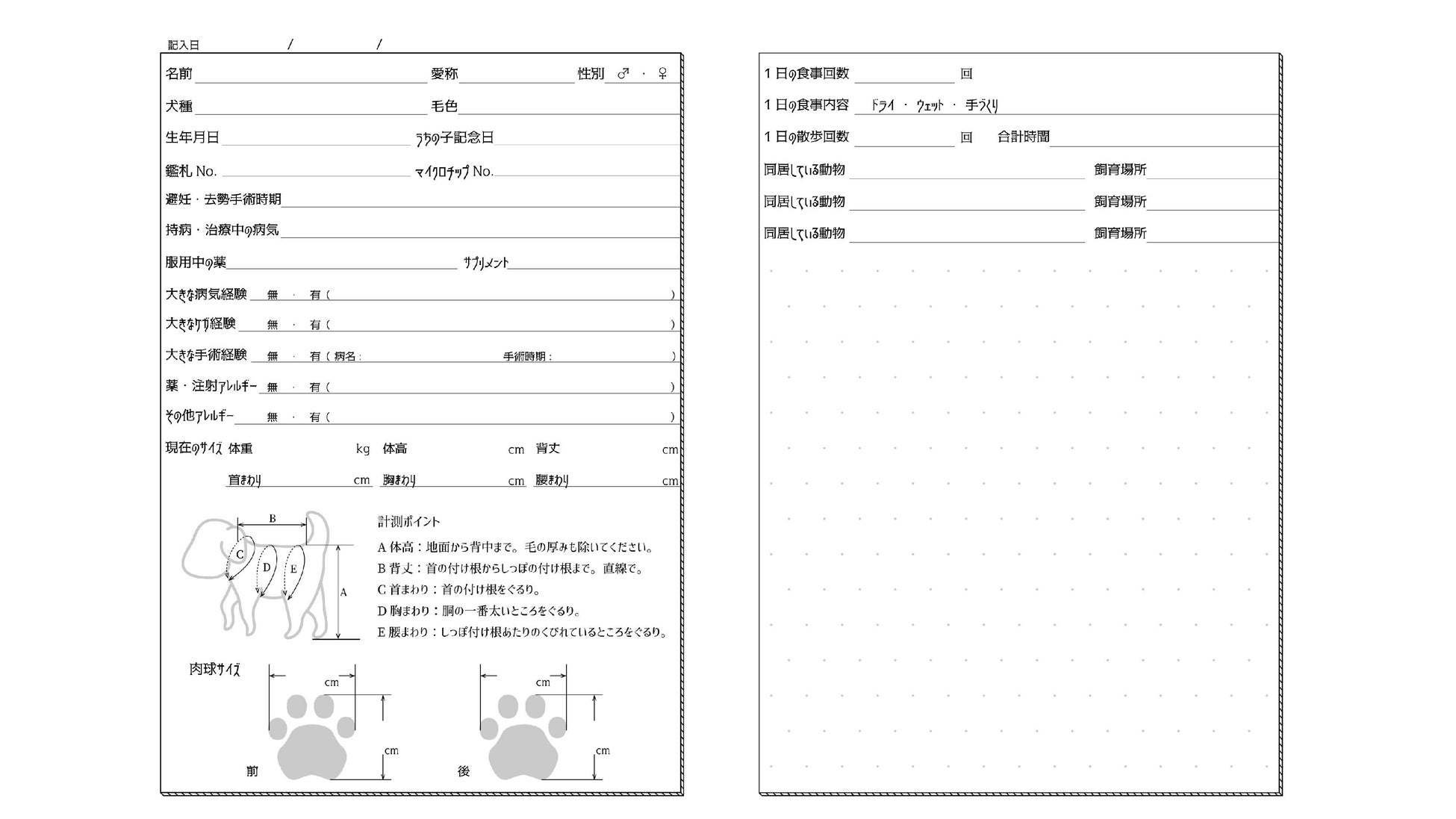 もしも自分に何かあったとき、人に預けるとき、行方不明や災害といった有事のとき、他の誰かが動物病院へ連れて行くことになったとき、必ず役立つ備えになります。愛犬用の防災手帳としてもご利用いただけます。