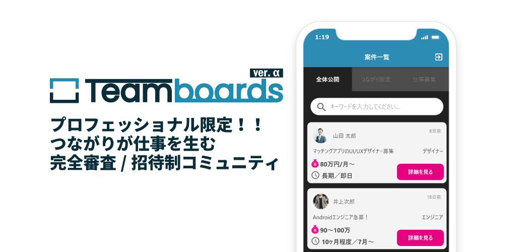 プロフェッショナル同士がつながり、案件をシェアする完全審査/招待制コミュニティアプリ「Teamboards」α版をリリース