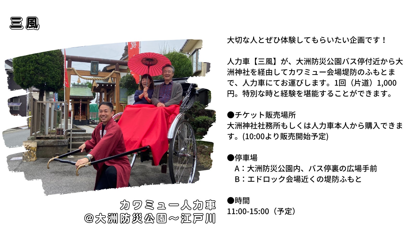当日は、江戸川河川敷や大洲神社会場でアートインスタレーション・ライブペインティング・フードトラックコーナーといった様々な催し物を企画しています。ぜひ皆さまのご来場を心よりお待ちしております。
