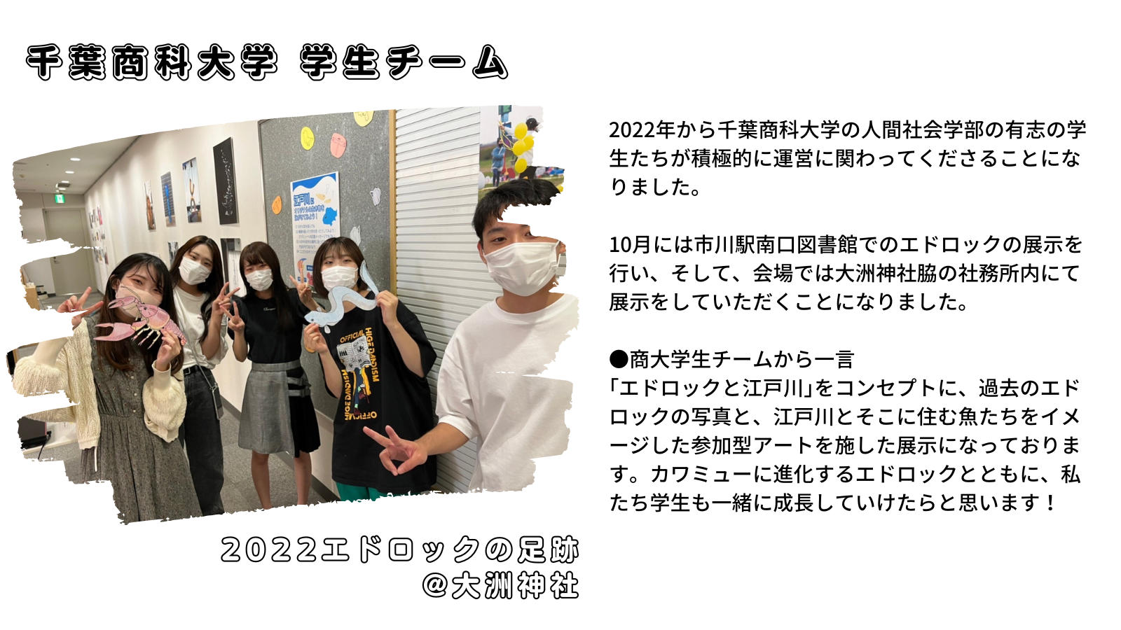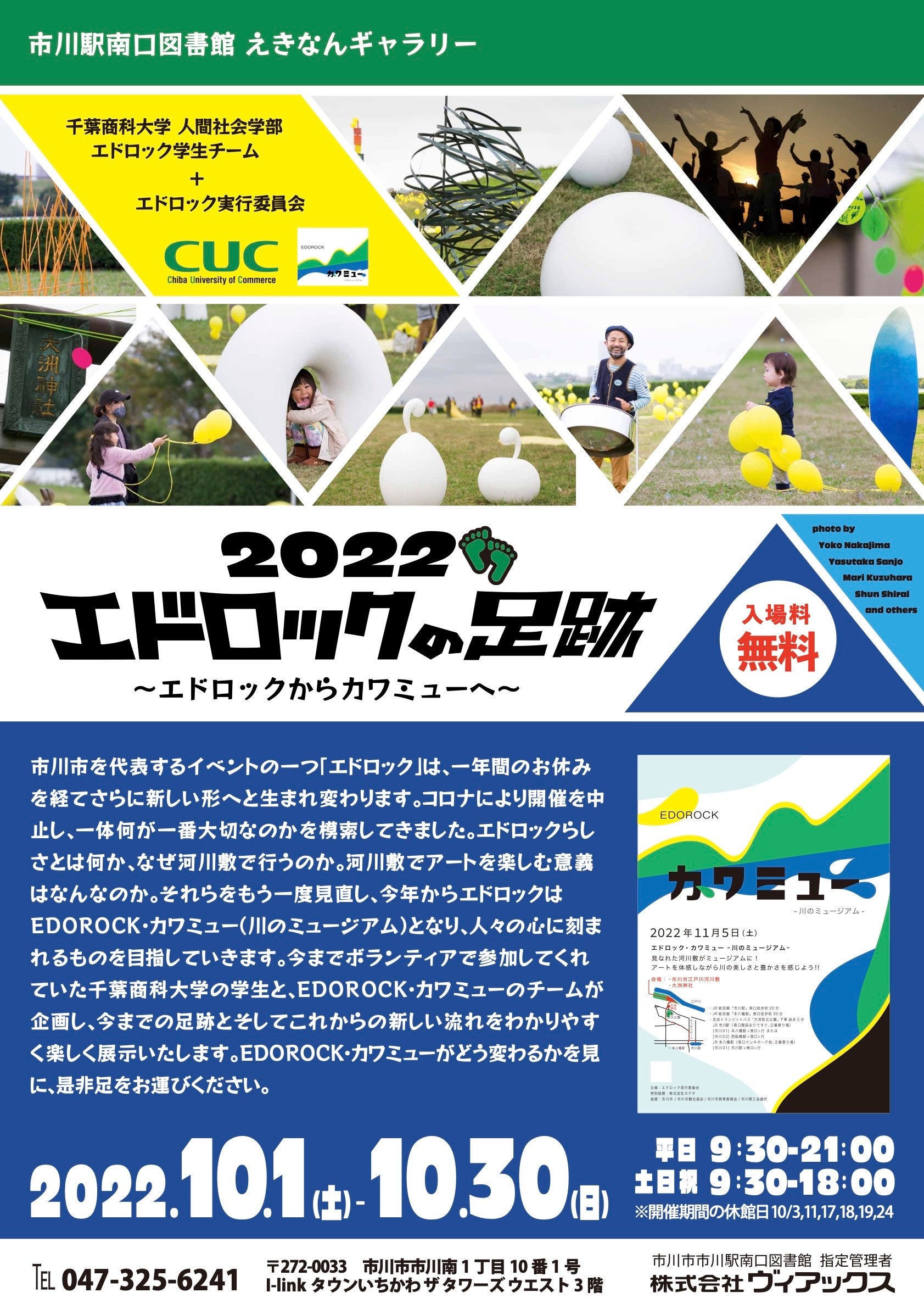 これまで「EDOROCK MUSIC & ART FESTIVAL」にボランティアで参加してくれていた千葉商科大学人間社会学部エドロック学生チームが企画し、エドロックのこれまでの足跡とこれからの新しい流れを展示いたします。