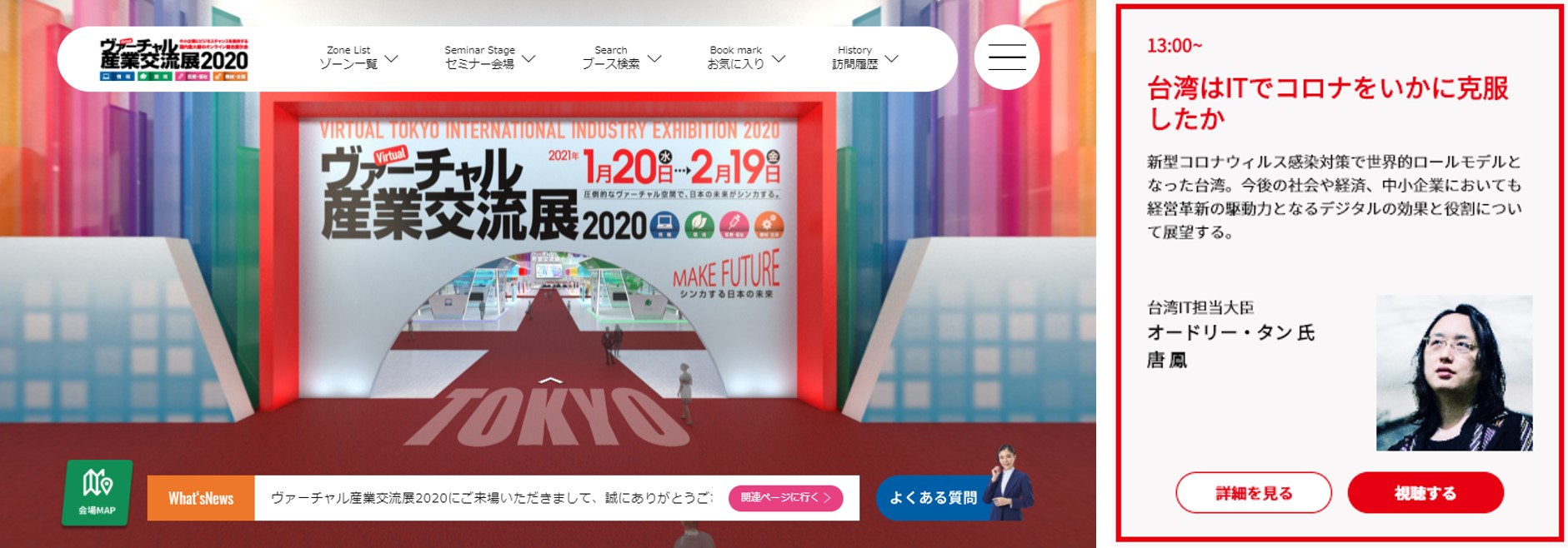 産業交流展2020実行委員会は、現在開催している中小企業の優れた製品・技術を一堂に展示する国内最大級のトレードショー「ヴァーチャル産業交流展2020」のなかで、台湾IT担当大臣 オードリー・タン氏による海外スペシャル講演を1月21日(木)13時より公開します。