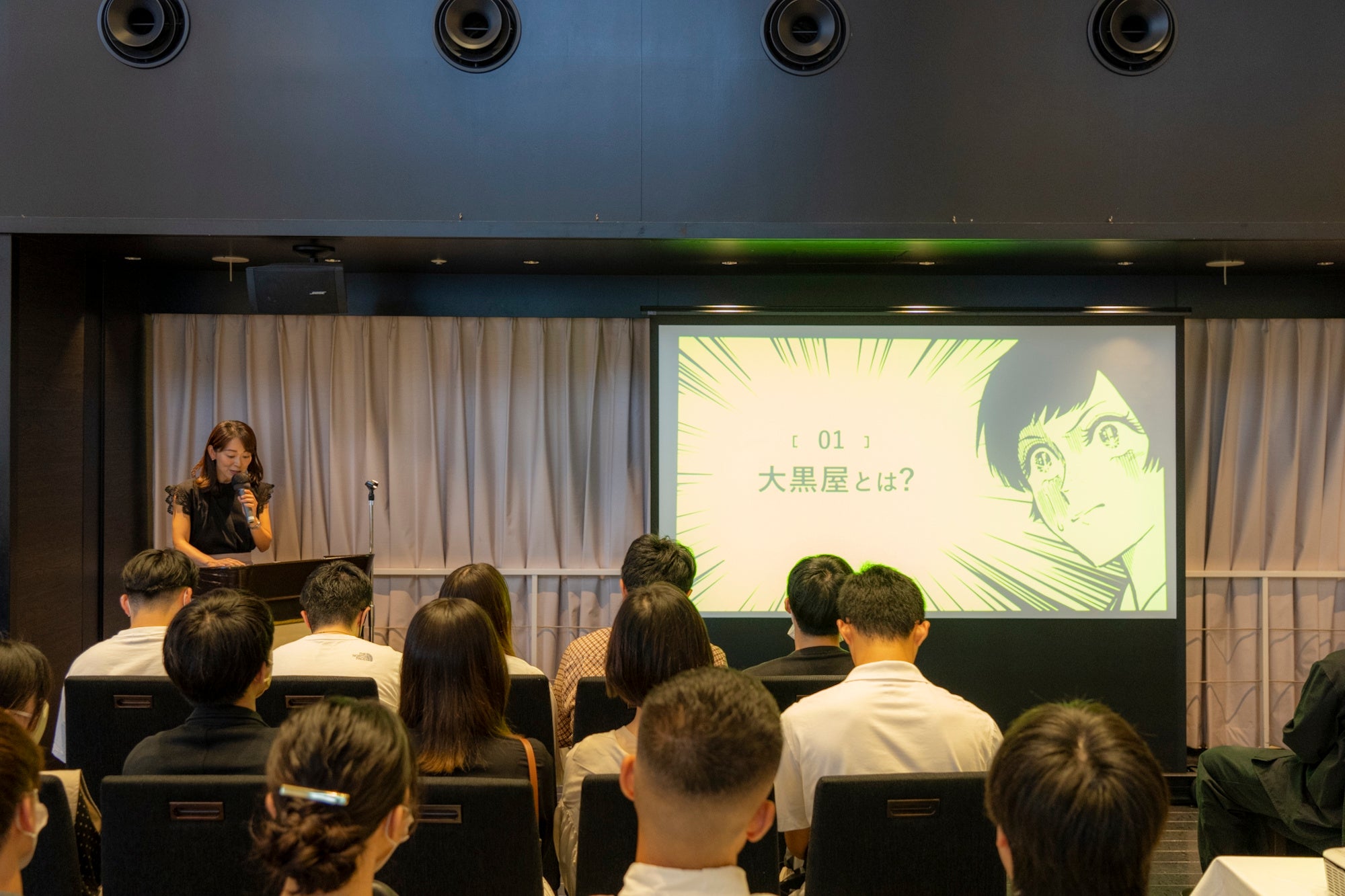 クラブハウスに集まった、参加者である就活生たち。まずは大黒屋について知っていただくべく、MCより企業説明を行いました。