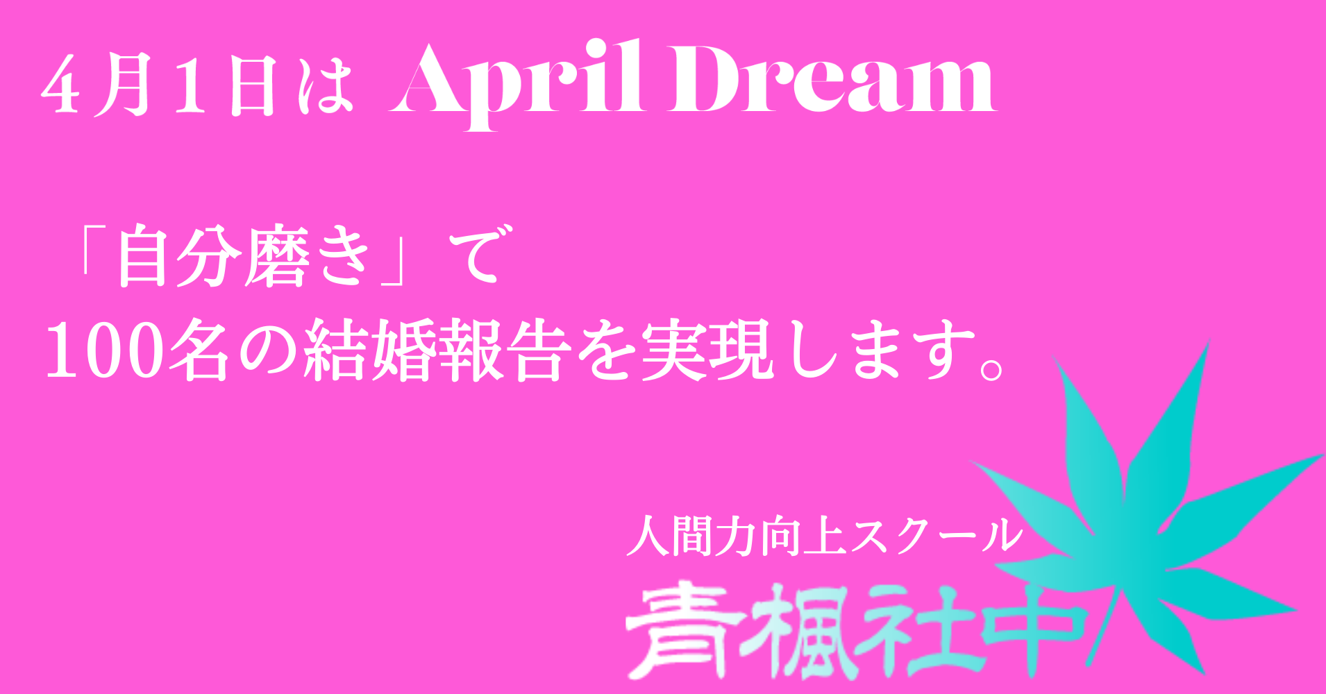 婚活を支援するスクール「青楓(あおかえで)社中」(東京都日野市・代表:菅谷マーシャ)は1.相手を思いやる気持ちを育てる。2.自分自身の身なりを清潔に整える。3.美しい所作を身につける。 4.好感のもてる装いができる。5.相手をエスコートできる。6.マナーが身についている。という6大カリキュラムを基本とし、内面と外面がバランスよく磨かれた生徒様を世に送り出します。そのことによって、スムーズに生徒様の婚活が成功する手助けをいたします。2025年4月1日に「100人の卒業生が幸せな結婚をしている」というプレスリリースを配信します。当社は、4月1日を「夢を発信する日」にしようとするApril Dreamに賛同しています。このプレスリリースは、人間力向上スクール「青楓(あおかえで)社中」の夢です。