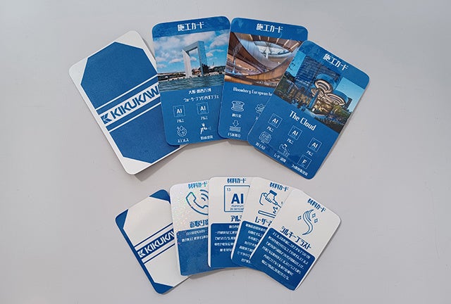 菊川の施工事例と技術をもとに考案されたオリジナルカードゲーム。内定者や新入社員を対象とする研修等で、楽しみながら自社の施工事例を学ぶのに役立つ。