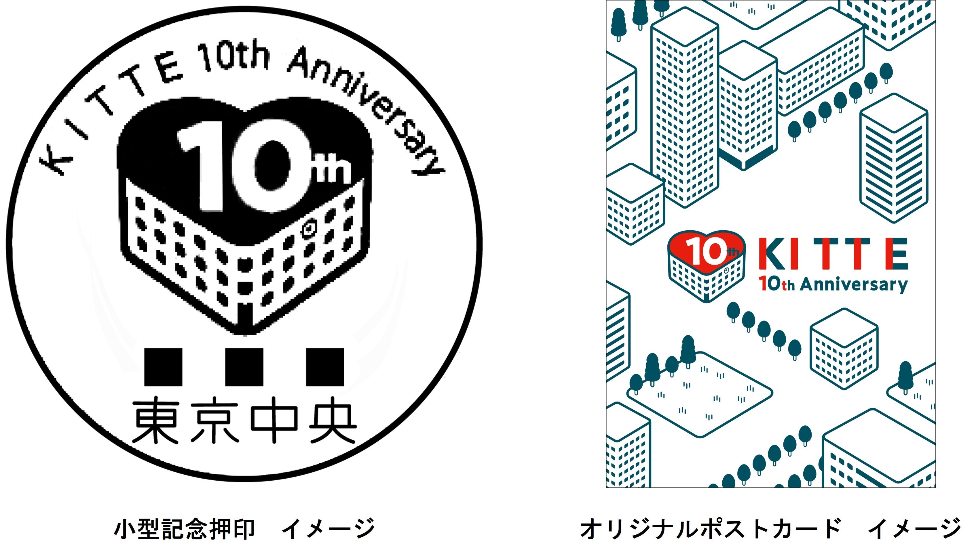 東京中央郵便局では「KITTE10thオリジナルポストカード」を3月21日(火・祝)から11月30日(木)まで販売します。また、3月21日(火・祝)及び3月26日(日)の2日間、開業10周年ロゴをモチーフとした「小型記念日付印」の押印を行います。(押印には、63円以上の切手の貼付が必要です。)