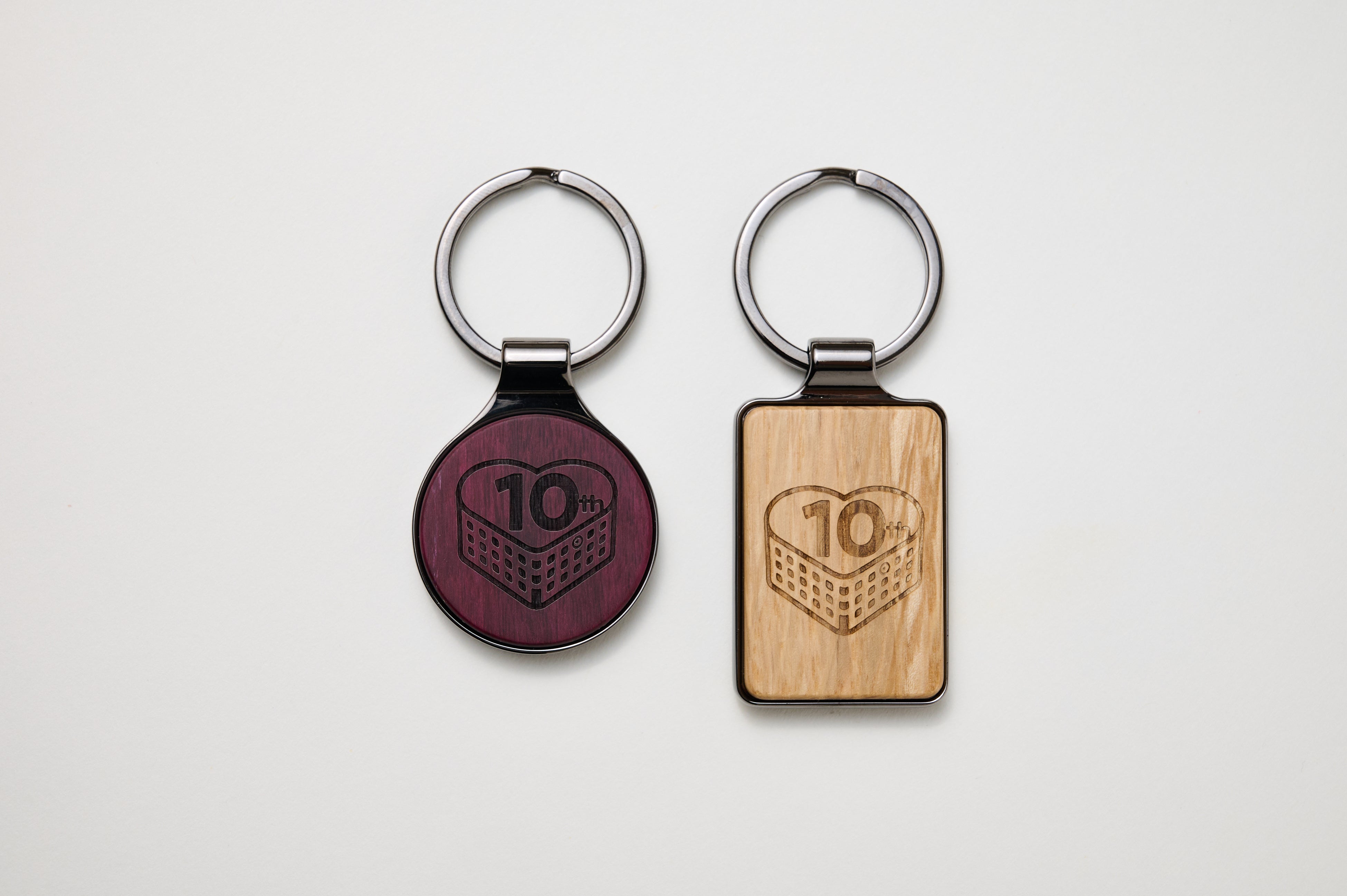 銘木の美しさをプラスしたキーリング。10周年ロゴ以外にも、名入れ刻印が可能です。