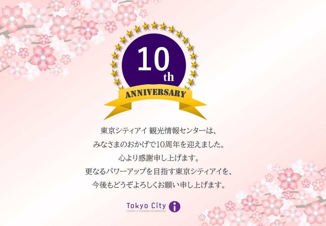 東京シティアイでは、日頃のお客様への感謝の気持ちを込めて、施設内インフォメーションゾーンで「10周年企画」と題して桜の装飾をあしらったイベントを実施します。10年の間に出会ったお客様とのエピソードの展示や、来場者プレゼント(数量限定)、土・日・祝日にはお子様向けのお菓子のつかみどりも実施予定です。