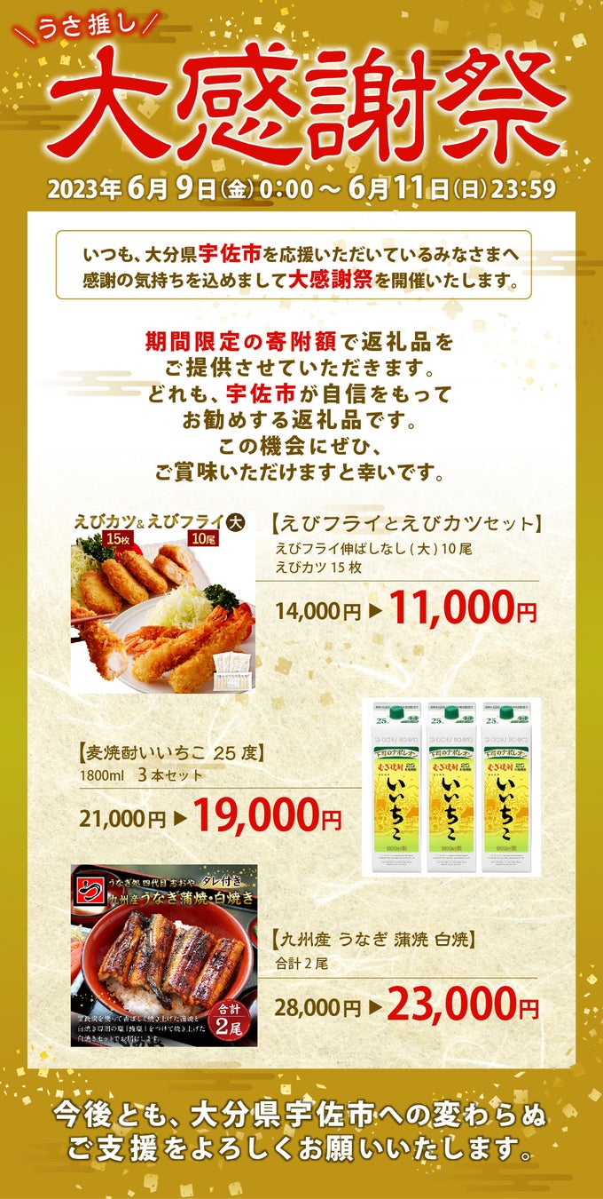 【ふるさと納税】うさ推し!期間限定で「えびカツ」「いいちこ」「うなぎ」を特別寄附額で!