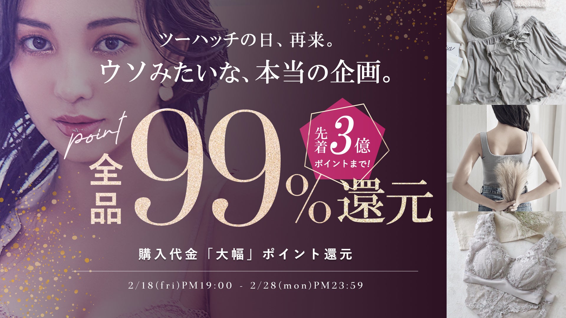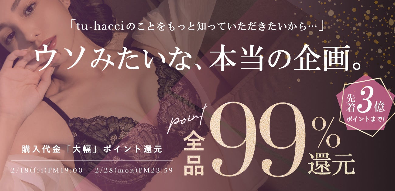 レディースインナーショップtu-hacci(ツーハッチ)では、tu-hacciの日として2022年2月18日(金)19:00~2022年2月28日(月)23:59まで、先着3億ポイント限定で全品99%ポイント還元キャンペーンを実施することが決定したのでお知らせします。インスタグラムで話題沸騰中のナイトブラやブラトップももちろん対象。売切れ商品が続出する大人気企画なので、欲しい商品は早めのGETがおすすめです。tu-hacci公式サイト:https://www.tu-hacci.co.jp/