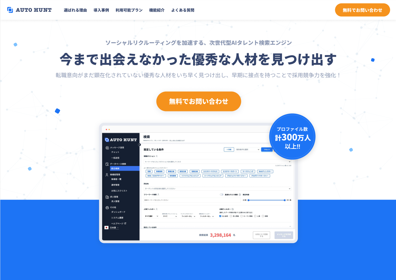 「AUTOHUNT」は、Web上に分散している人材や企業情報をはじめとした様々な公開情報をもとに、優秀な人材を横断して検索できる、AIタレント検索エンジンです。