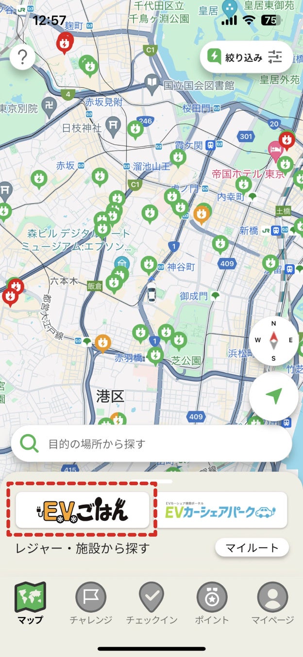 おでかけEVのMAP画面下部に「EVごはん」ボタンが設置されました。
