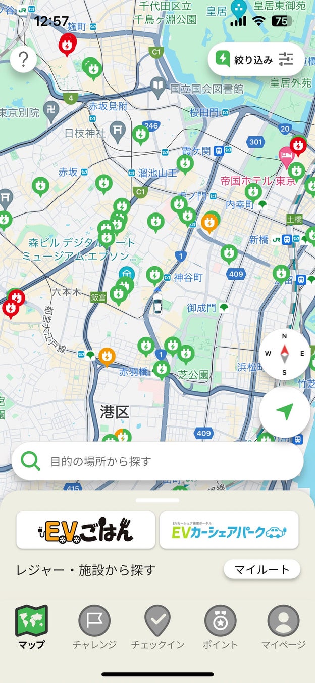 2023年5月、株式会社ナビゲートがリリースしたEV充電スポット検索アプリが 「おでかけEV」 です。EV利用者が安心して楽しく出かけられるアプリサービスとして、最新のEV充電スポット情報 約37,500台(2024年5月時点)はもちろん、全国のおでかけ先の施設情報 約6,800件(2024年5月時点)を独自保有し、MAP上に表示、ルート案内も可能。さらに「移動距離」「口コミ投稿」「チェックイン」「キャンペーン」等で 【ポイント】が貯められ、 電子マネーやギフト券等に 交換できる機能 など、使えば使うほど楽しさが満載のアプリです。