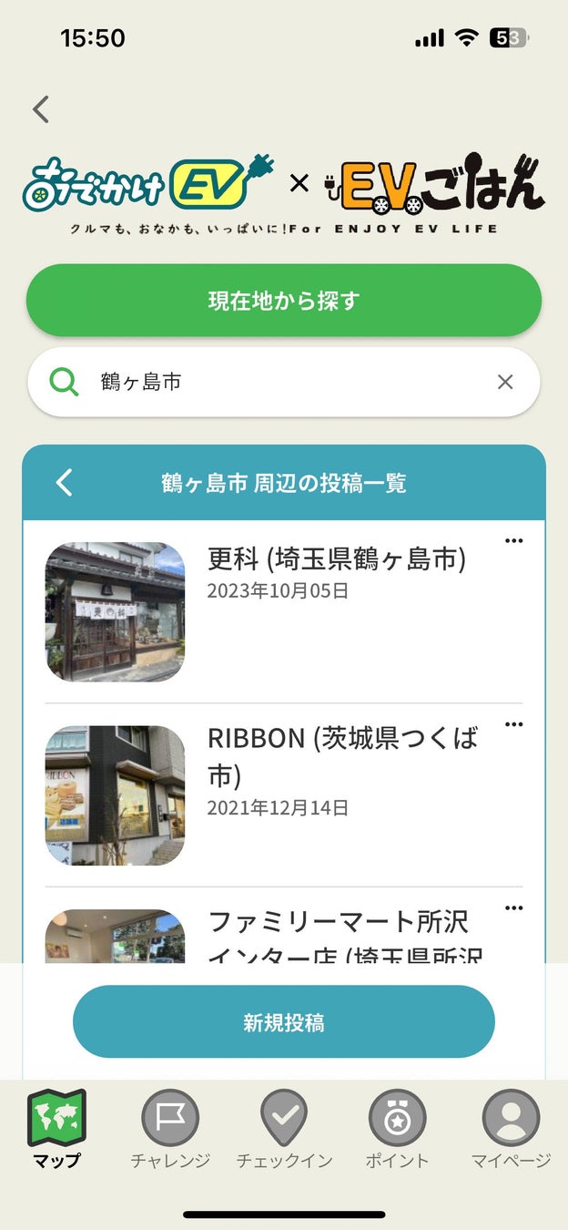 クリックすると「EVごはん」情報リストが閲覧できます。検索ワードを入れて検索も可能。また、新規投稿ボタンより新しいお店の投稿もでき、ポイントも貯まります。