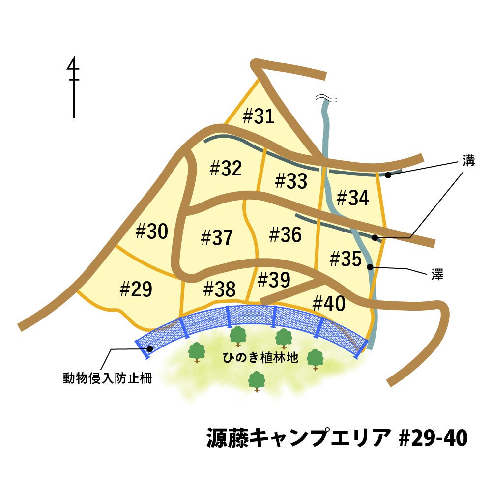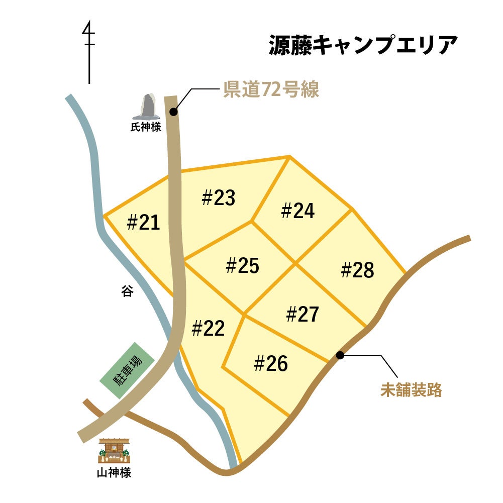 源藤エリアは標高約700mの山の中に位置し、全体的になだらかな地形はキャンプに最適。
