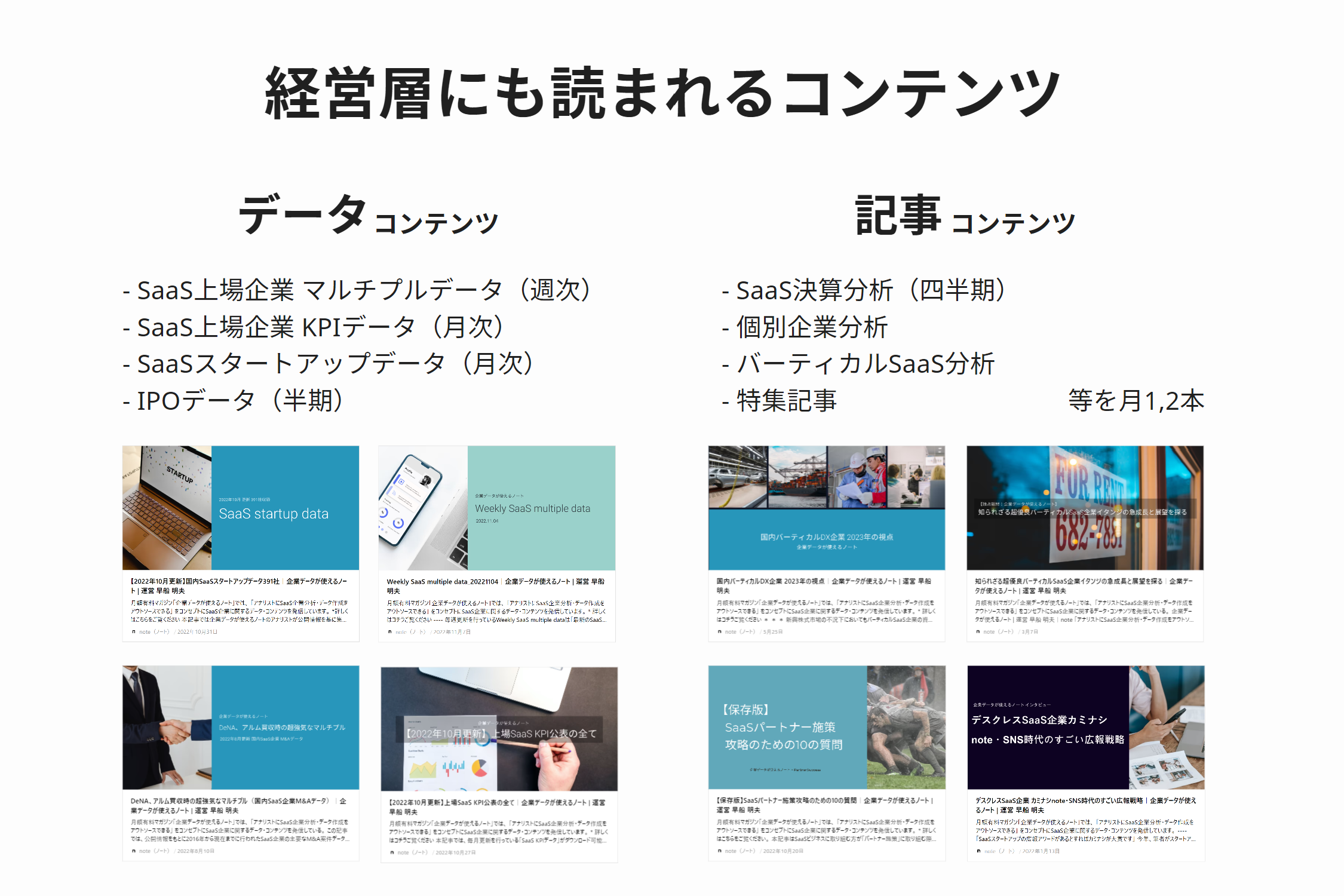 今年で運営4年目を迎える有料マガジン「Primary(旧:企業データが使えるノート)」では、SaaSのKPI、M&A、IPO、バリュエーションなどの独自データを提供することで、上場SaaS企業やスタートアップの経営層、マネジメント層から多くのユーザーを抱えています。特に詳細な分析を伴った記事は上場企業やスタートアップの経営者から高く評価を受けています。