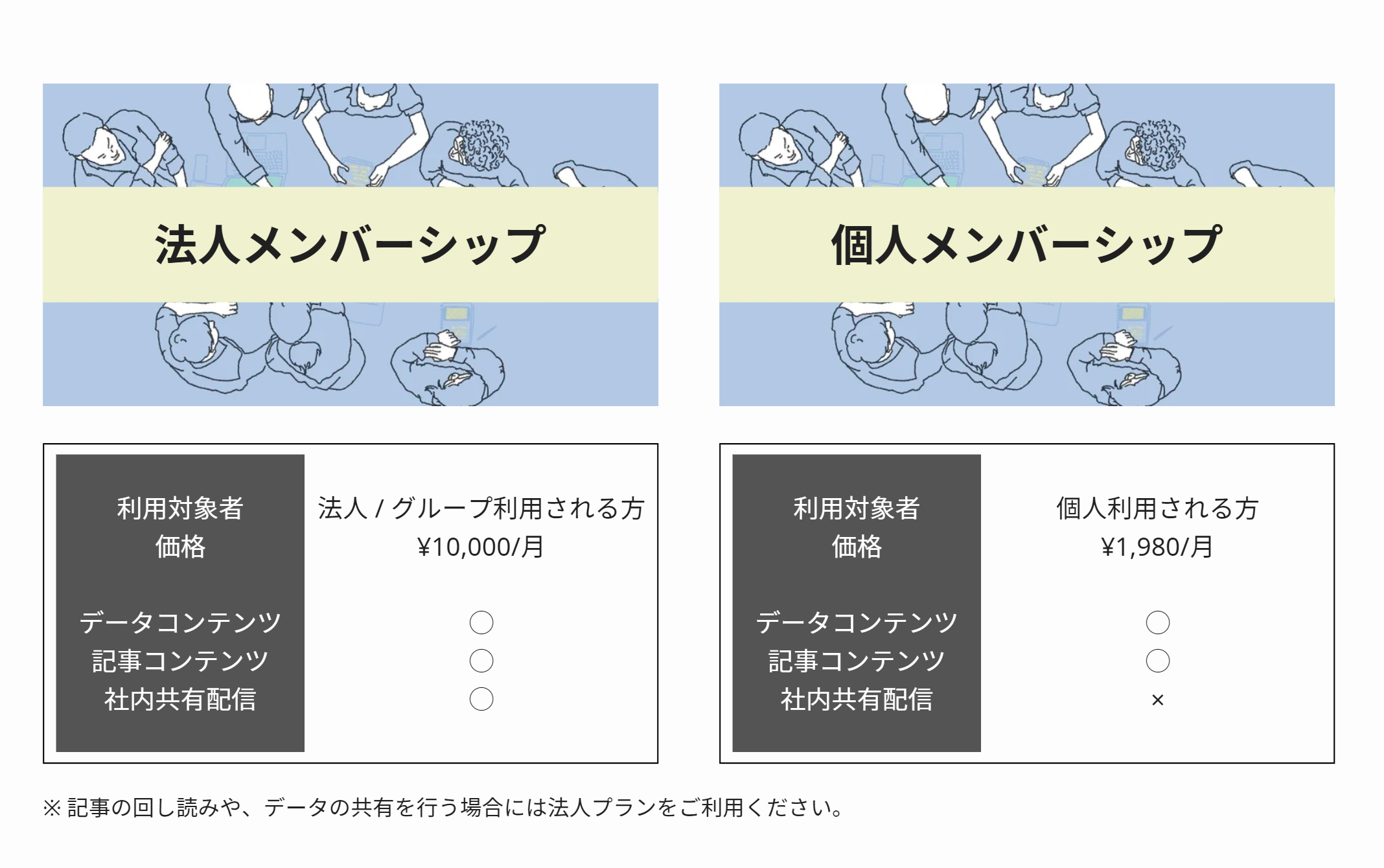 メンバーシップは、「個人版」と「法人版」の2つのプランをご用意しております。