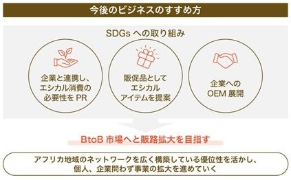 今後は、個人のみではなく企業のSDGs需要の取り込みを強化し、BtoB市場へと販路拡大を目指します。また、「Kipekee」のプラットフォーム化を推進し、アメリカでも販売を開始する計画です。弊社は大量生産、大量消費ではなく、サステナブルな用品が当たり前になるような、エシカルファッション(地域社会、自然環境などを思いやって作られた洋服)を普及させるゼブラ企業(社会貢献と企業利益を両立する企業)として成長してまいります。