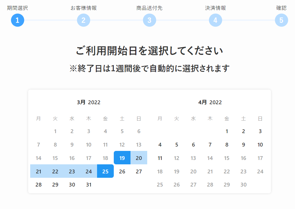 1.インターネットの申し込みフォームから利用したい期間(1週間)を選択し、申し込み手続きをいたします。利用期間は実際に必要な日の前日を初日に設定することを推奨します。