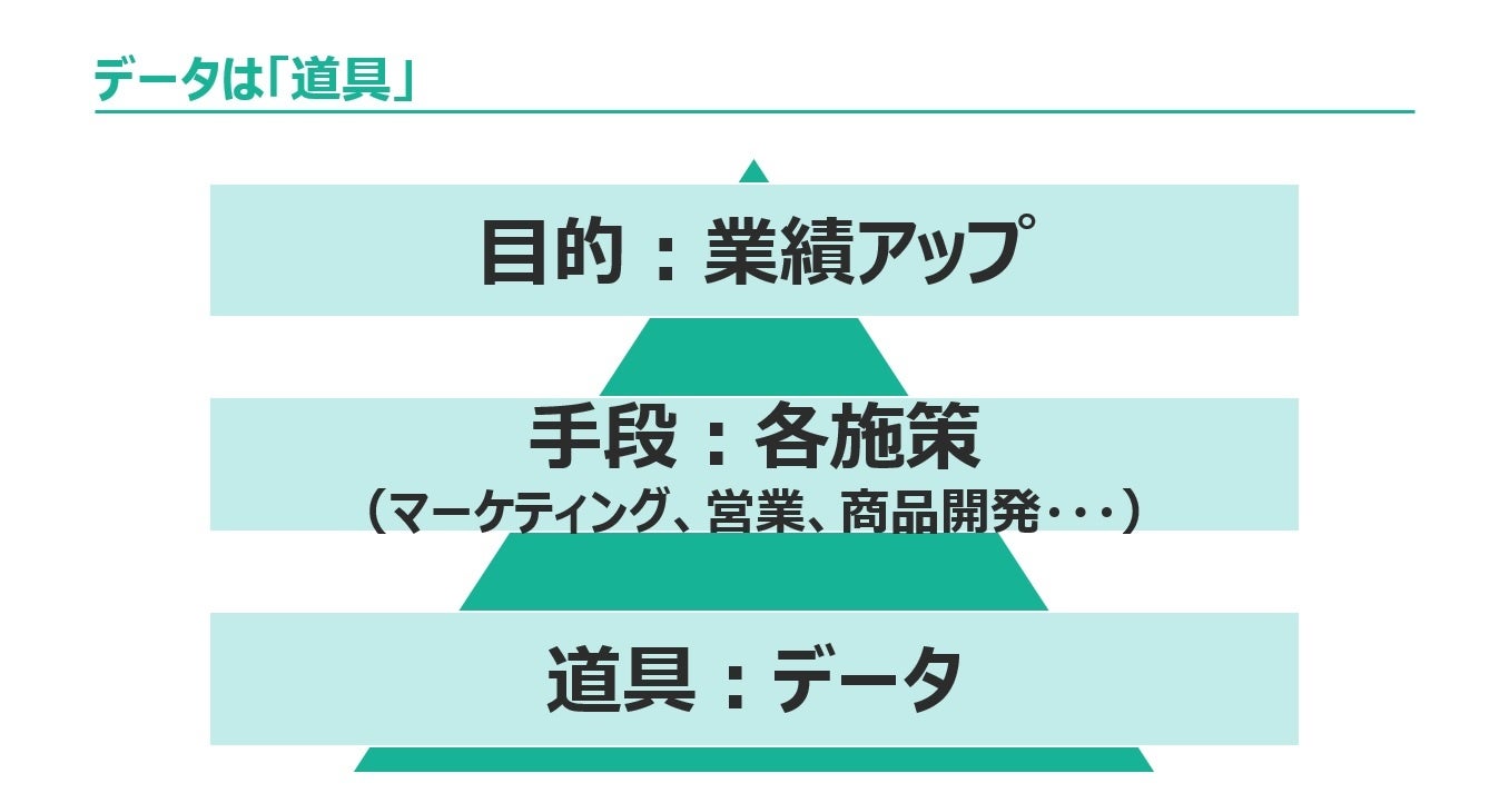 売上向上などの業績アップが企業の目的であり、そのための手段としてマーケティングや営業、商品開発等、様々な施策を講じます。その施策の効率性を高める上で「データ」は道具として存在しますが、なかなかそれがイメージできないのではないでしょうか。