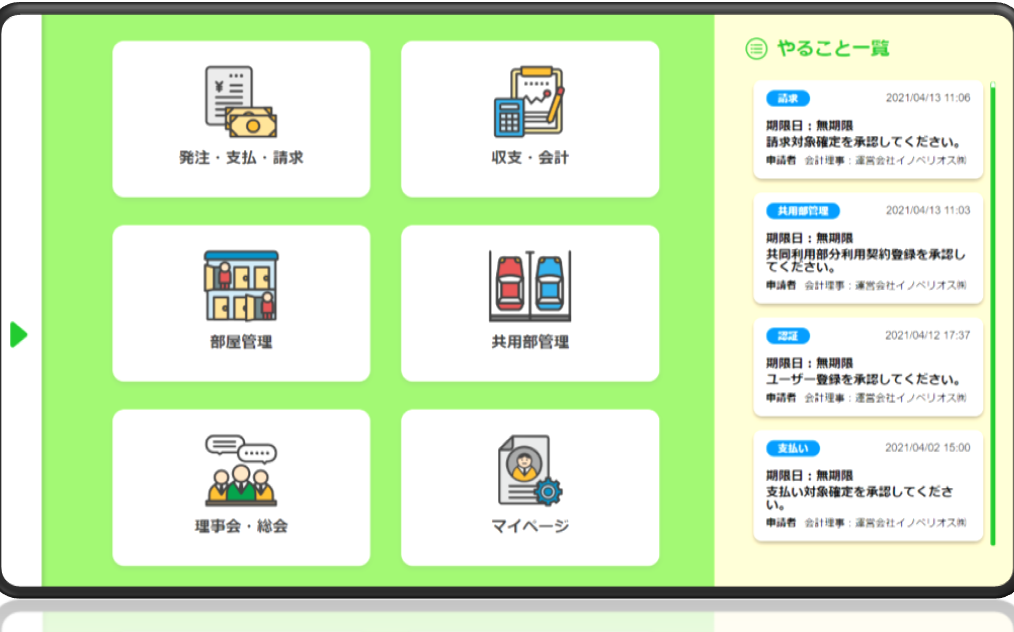 管理会社に全ての業務を委託せずとも円滑な管理運営が可能となるマンション管理アプリです。管理組合運営に必要な機能が全て揃った日本初のサービスであると認識しており、特許を出願しております。(特願2020-095642)