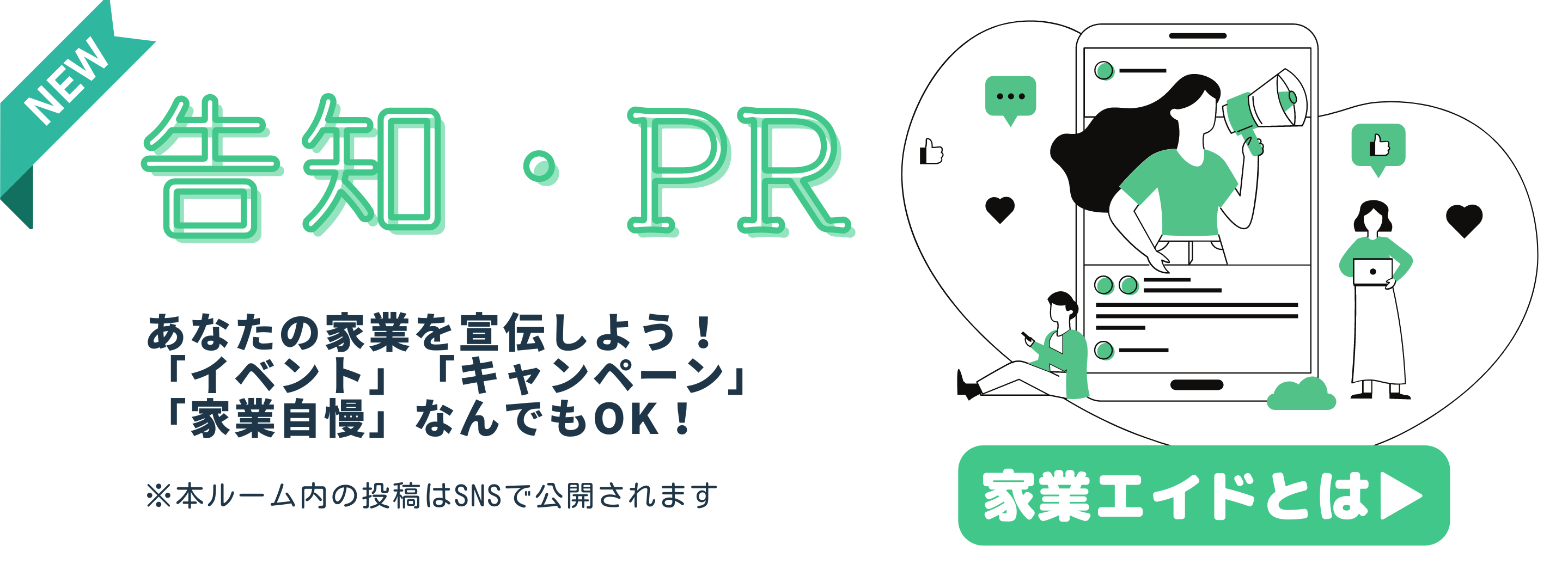 - 家業のマーケティング活動が可能な「告知・PR」ルームを設置