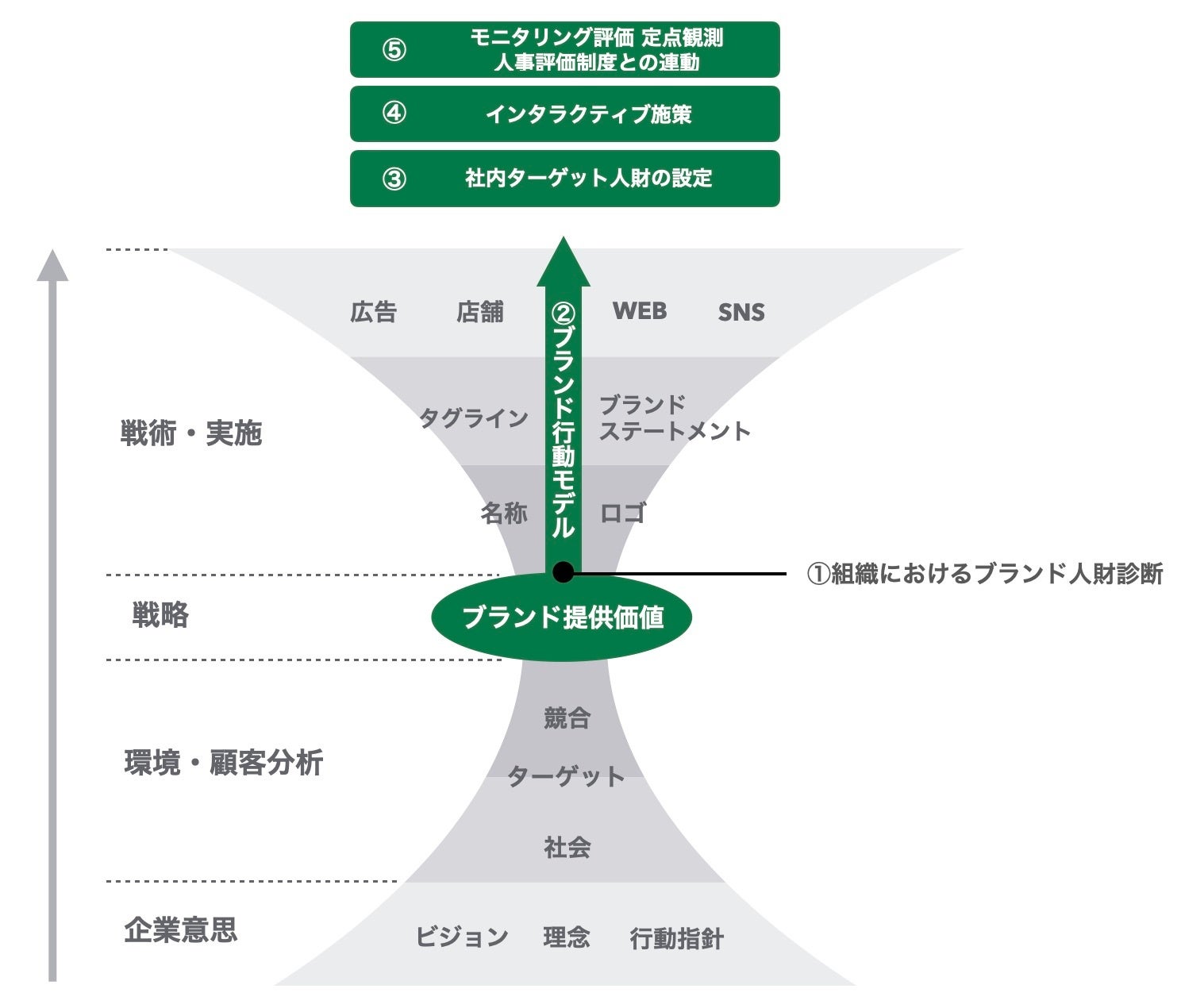ブランド提供価値がステークホルダーに浸透していくためには、策定したブランド戦略を具体的に遂行し続けるための原動力となる人財が必要です。まず、社内でブランド提供価値が理解され、社員の行動変容・意識変容を促さなければなりません。