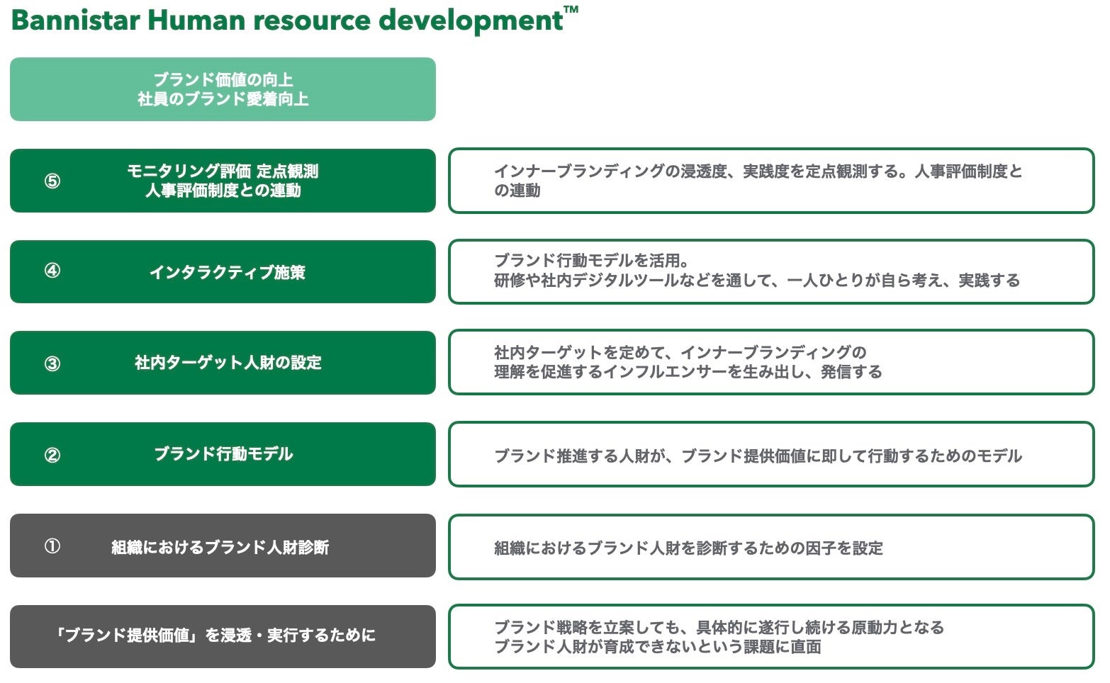 「BANNISTAR Human resource development ™」は、ブランドにより価値提供を具体的に実践し続ける組織内のコア人財を育成するためのプログラムとして開発しました。