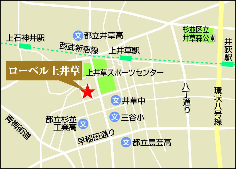 上井草は荻窪駅や石神井公園などへも近く、西武新宿線やバスを使うことで多方面へアクセスが良いエリアです。都心への通勤者が多いベッドタウンでもあるため、治安も良く安心してお過ごしいただけます。
