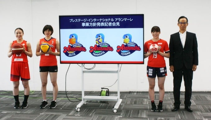 プレステージ・インターナショナル アランマーレ(以下「アランマーレ」)は、アランマーレ秋田(バスケットボール)、アランマーレ山形(バレーボール)、アランマーレ富山(ハンドボール)の3チーム合同の事業方針発表記者会見を6月10日(金)、山形県酒田市にて実施いたしました。