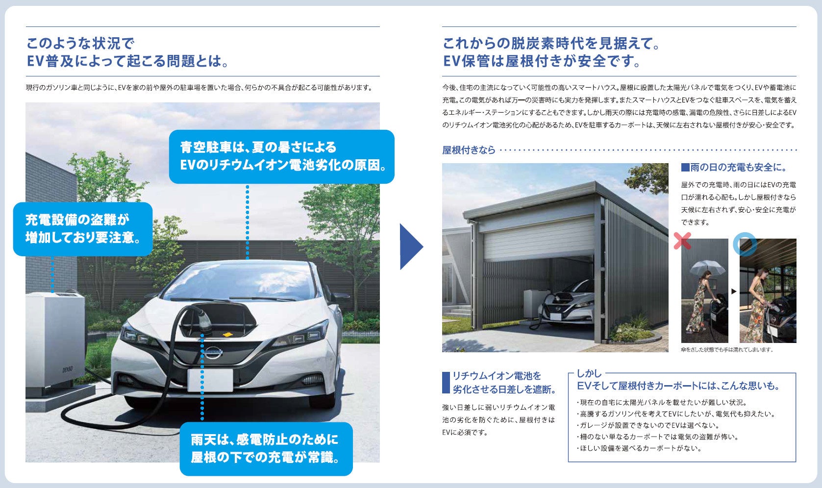住宅におけるEVの保管環境は、住宅内に駐車空間を有するビルトインガレージタイプが最適であるものの、我が国の住宅事情ではその比率は全体の数パーセント程度。そこでエスイーエーが構想・企画したのが、屋根で発電でき、EVを日射と雨天から護りつつ、防犯性とレジリエンス性にも優れる次世代型複合ソーラーカーポート「ezポート®」でした。
