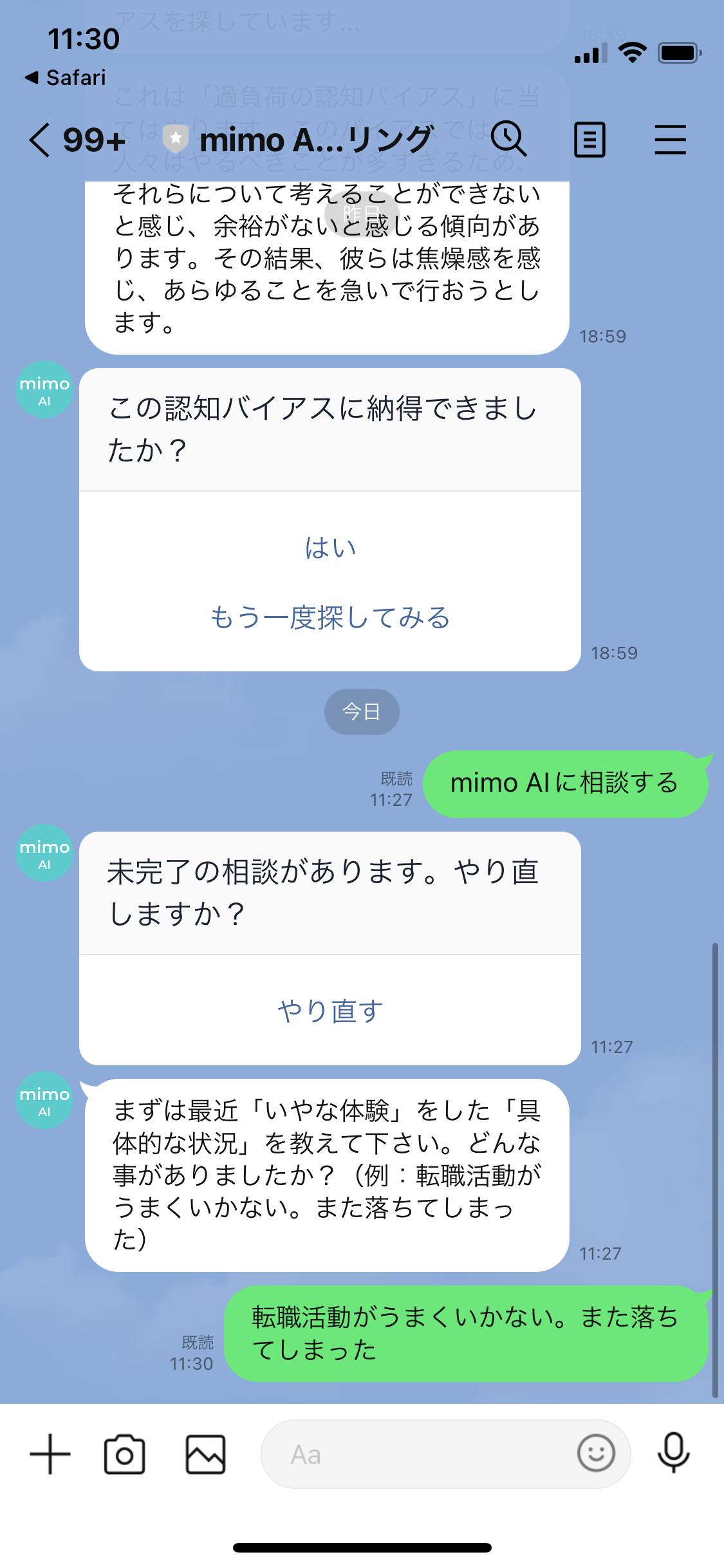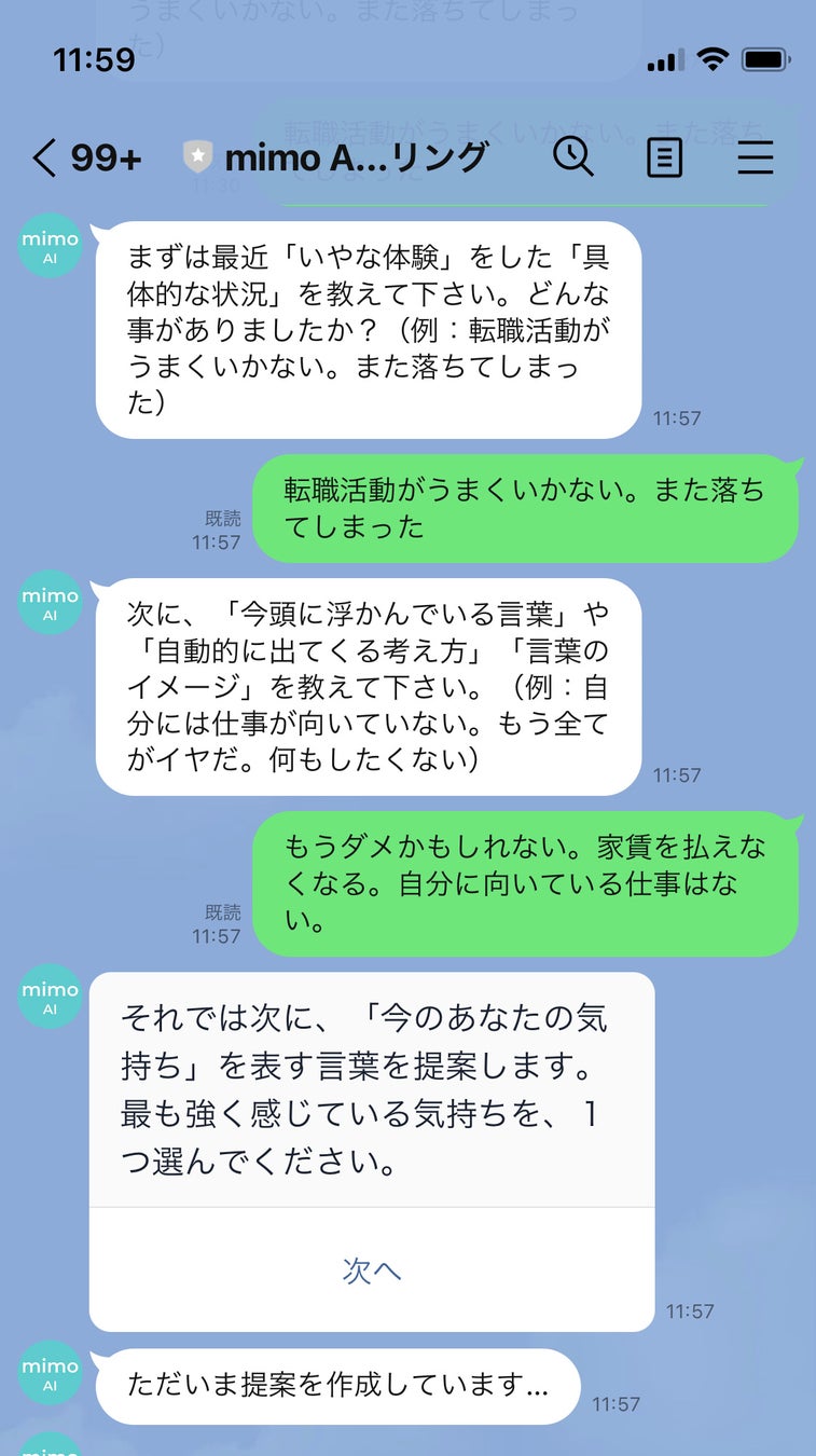 そこで、LINE上で、問題や悩みを具体的に記述さえすれば、あとはAIが「現在の感情」「自分の認知バイアス」「中立的な新しい考え方」を提案するmimo AIを開発いたしました。
