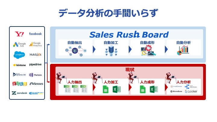そこでSrushは、データ分析に関わる業務が全てノーコードで実現可能なデータ分析 SaaS『Sales Rush Board』を提供することで、データ収集や分析にかかるエクセル業務をデスクワーカーから解放し、10兆円もの損失を価値に変える企業を目指しています。これまで『Sales Rush Board』はSaaS、プラットフォーム、流通、人材、ECなどB向けC向け問わず、様々な業界において、スタートアップから上場企業と幅広い企業様にご利用いただいており、エクセルからの脱却及び劇的な生産性向上に寄与してきました。今後も、データ分析業務に膨大な時間を費やすデスクワーカーのため、プロダクトを磨き込み、際限のない顧客満足度の向上に尽力して参ります。