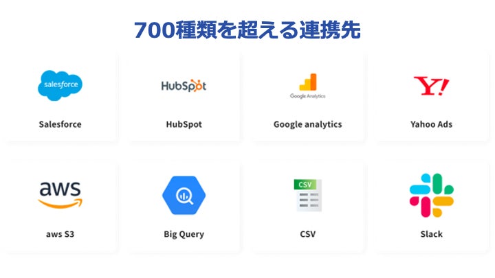 連携可能なツールはグローバルでもトップ水準の700種類以上。各種クラウド、ソフトウェア、自社システムのCSVデータ、エクセルのKPI管理データも、一瞬で連携が完了します。