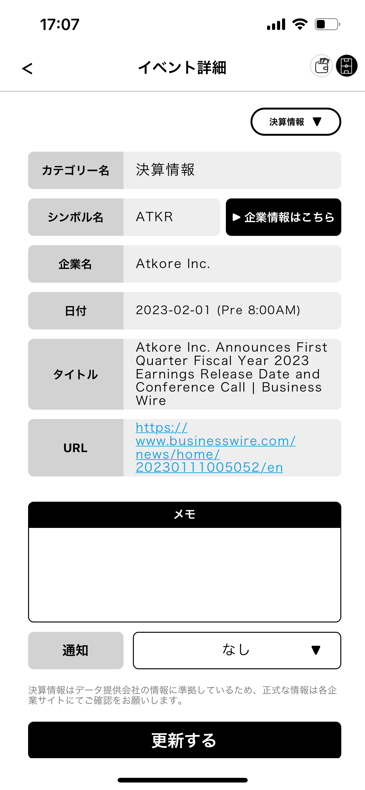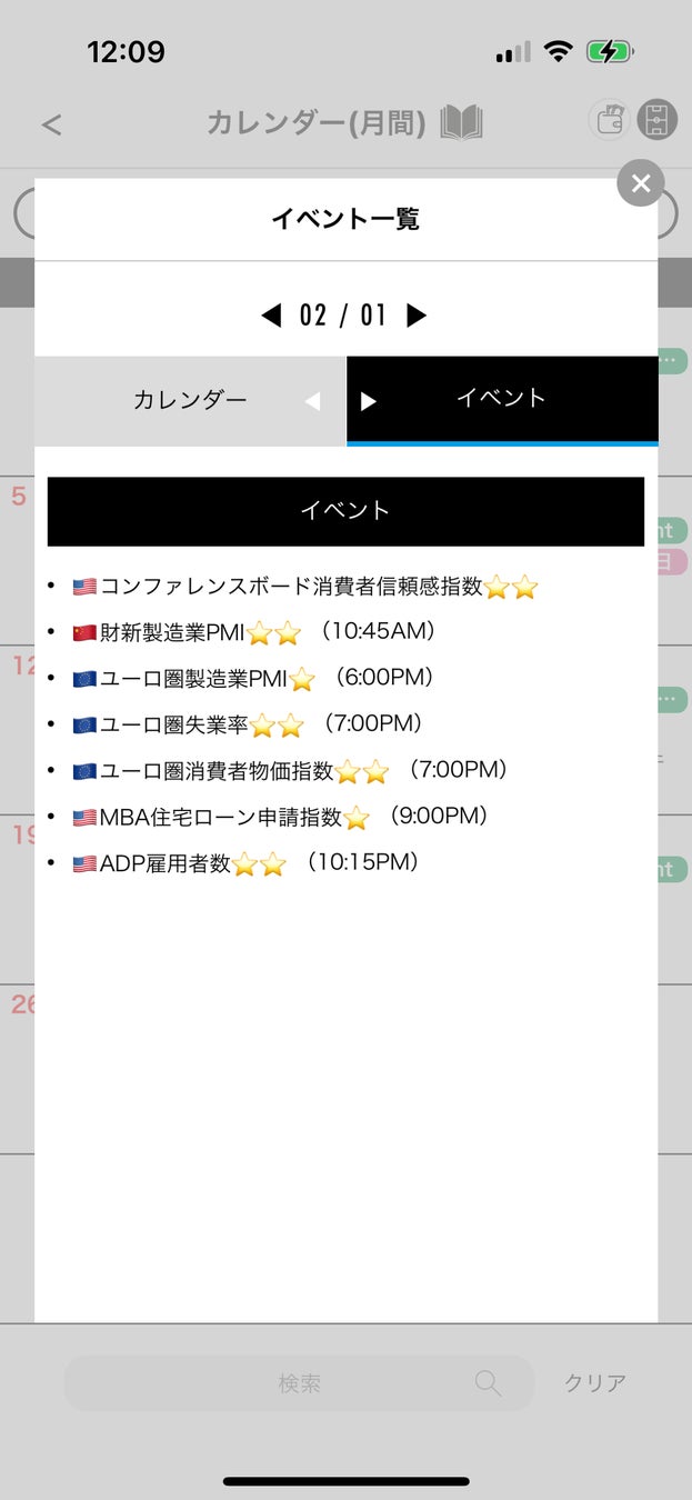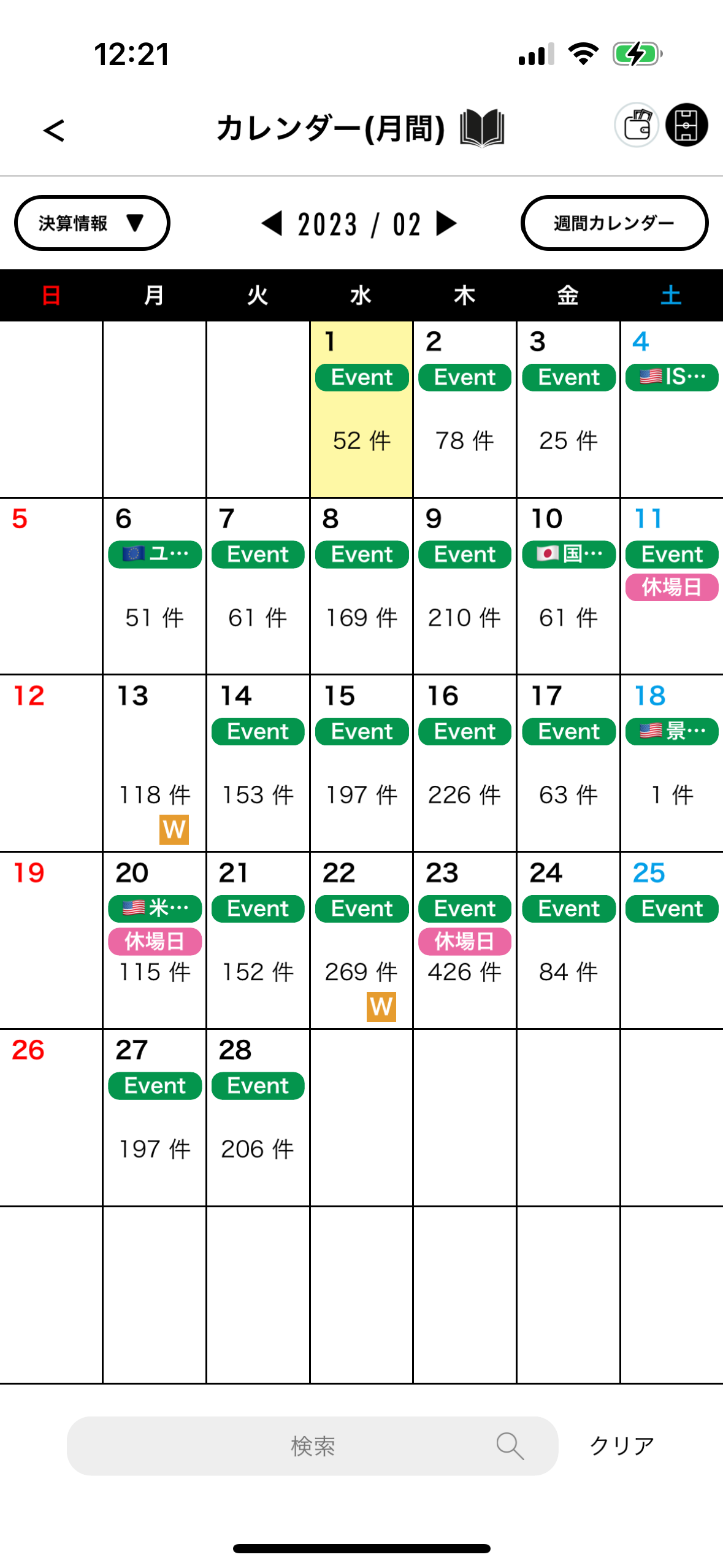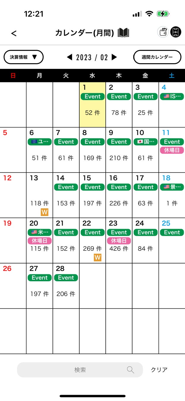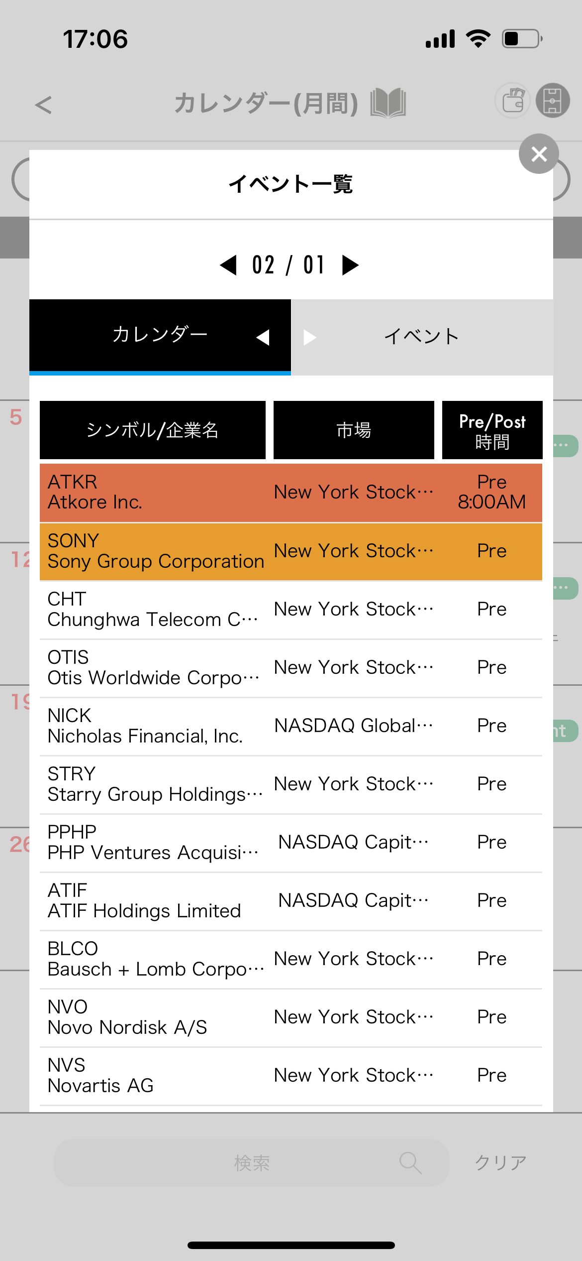 <銘柄タップで詳細情報、一覧のイベントタップでその日の予定イベント一覧が表示されます>