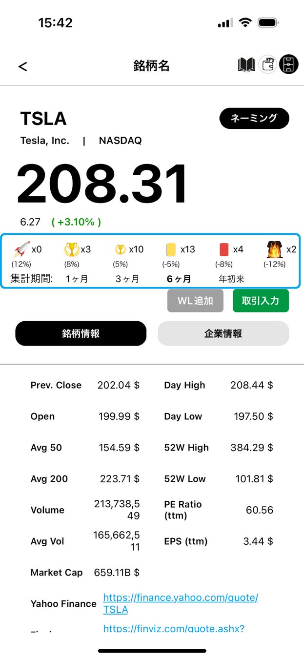 ゲームストックでは各銘柄で大きな上下動があった場合にロケットや王冠等のシンボルマークが表示されます。今回のアップデートにて個人のポートフォリオや、個別銘柄について過去にどのシンボルマークが何回発現したかの数字を表示することにより、自分のポートフォリオや各銘柄がどのような激しさで上下するのかを一目で確認することができるようになりました。