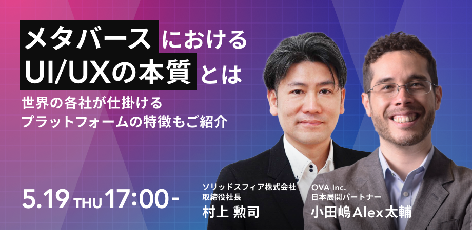 xR(VR、AR、MR)関連アプリ、ゲームアプリの開発を手掛けるソリッドスフィア株式会社は、OVA Inc. 日本展開パートナー 小田嶋 Alex 太輔氏と共同で、無料オンラインセミナー「メタバースにおけるUI/UXの本質とは〜世界の各社が仕掛けるプラットフォームの特徴もご紹介〜」をテーマに2022年5月19日(木)17時よりオンラインセミナーを開催いたします。