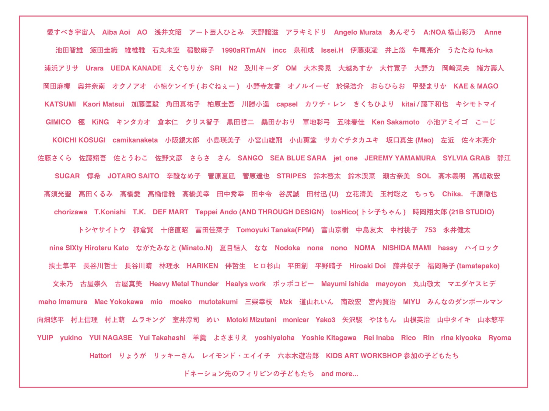 有名アーティスト、ファッションデザイナー、タレント、シェフ、美術学校の学生、小さな子どもたちなど幅広い方々、総勢261名の作品を匿名で展示販売を行います。作者を匿名にすることで、先入観なくアートを購入いただくことができ、展示終了後、購入いただいた方へ作品をお届けとともに、そこではじめて作者を知ることができます。