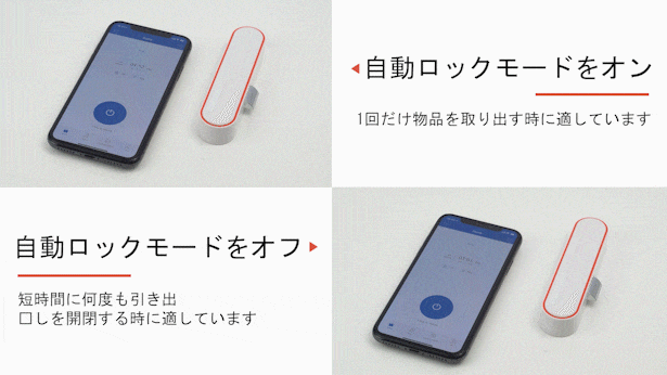 スマホで自動ロックと手動ロックの2つのモードを選択できます。忙しいオフィスでも、スマホでさっと楽々操作。もう鍵を探す手間も、鍵をなくす心配もありません!