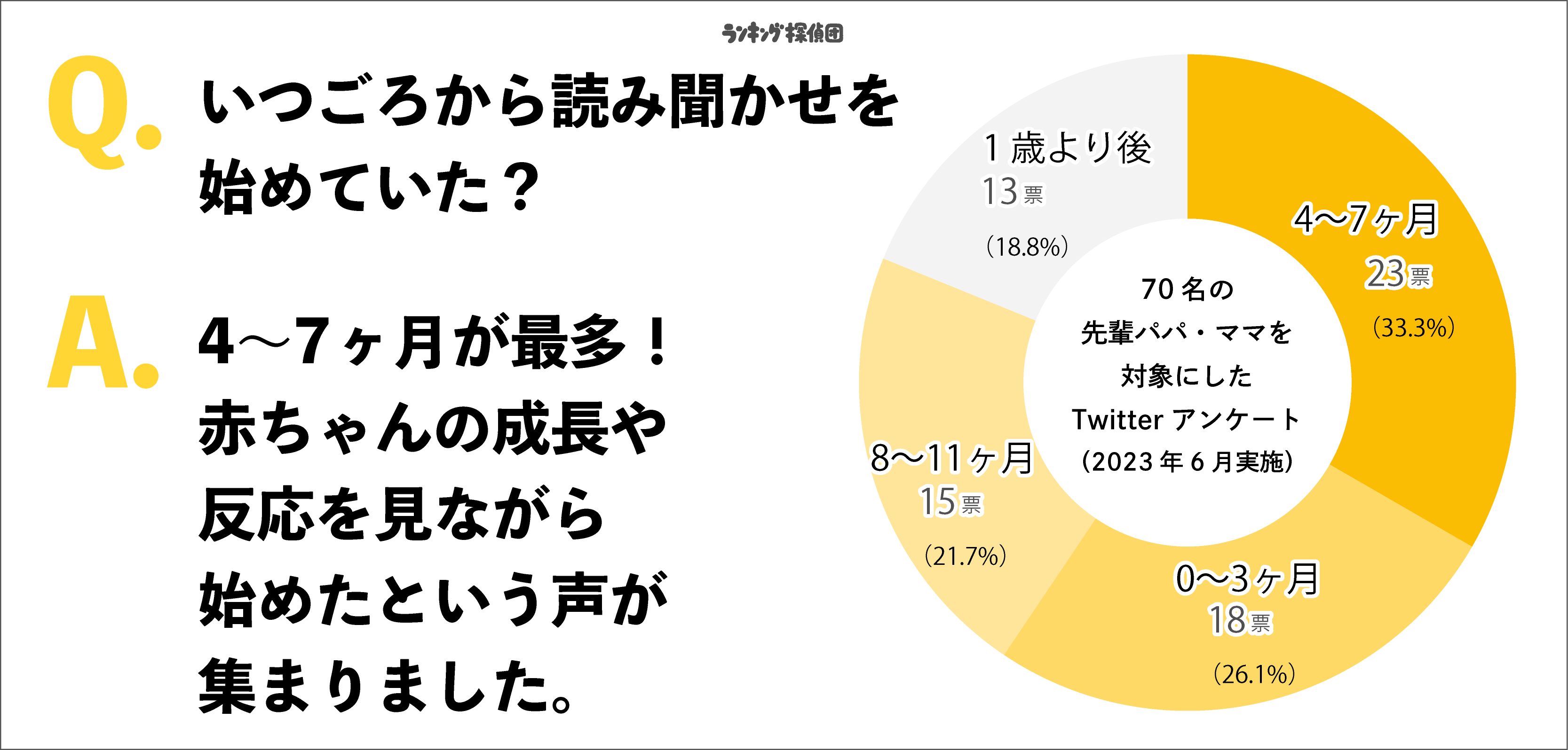 「読み聞かせ時期」を調査した初回のアンケートでは、「4〜7ヶ月」という意見が最も多く集まりました。